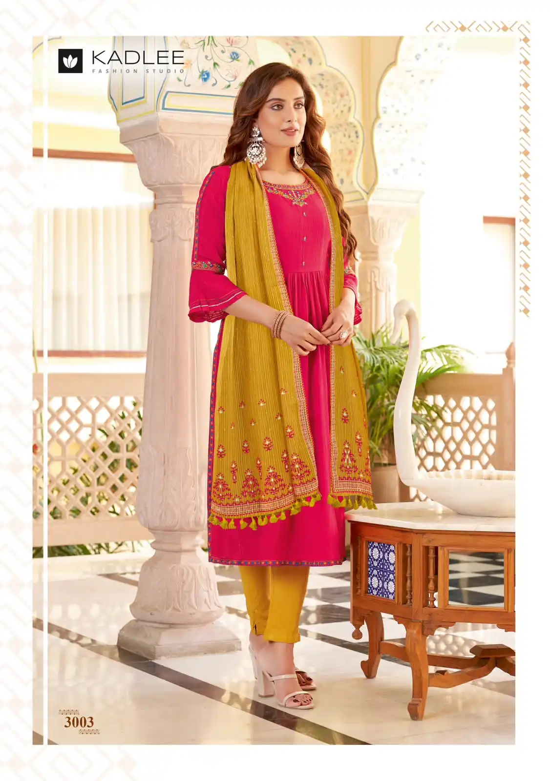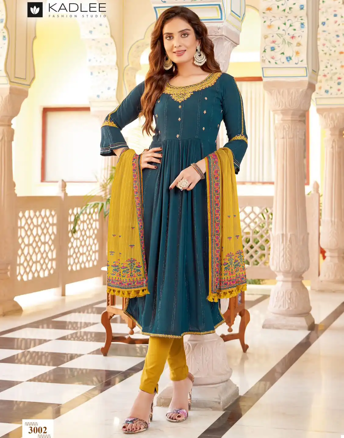 Kadlee Sangam Wrinkle Rayon Weaving Wholesale Readymade Salwar Suit Catalog 6 Pcs. We deal in Kurtis, Sarees, Dresses Materials, Leggings, and Designer Salwar Kameez.