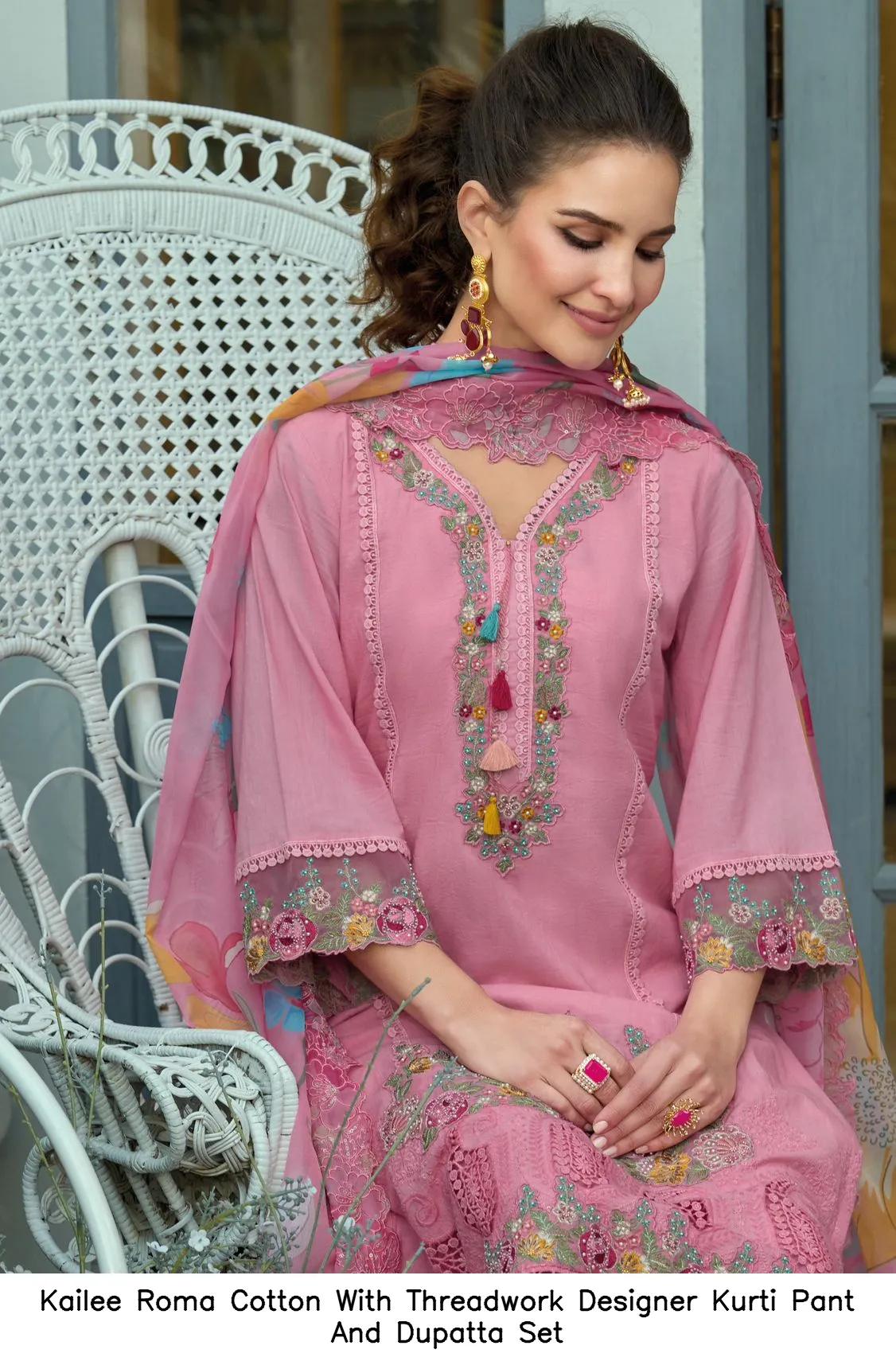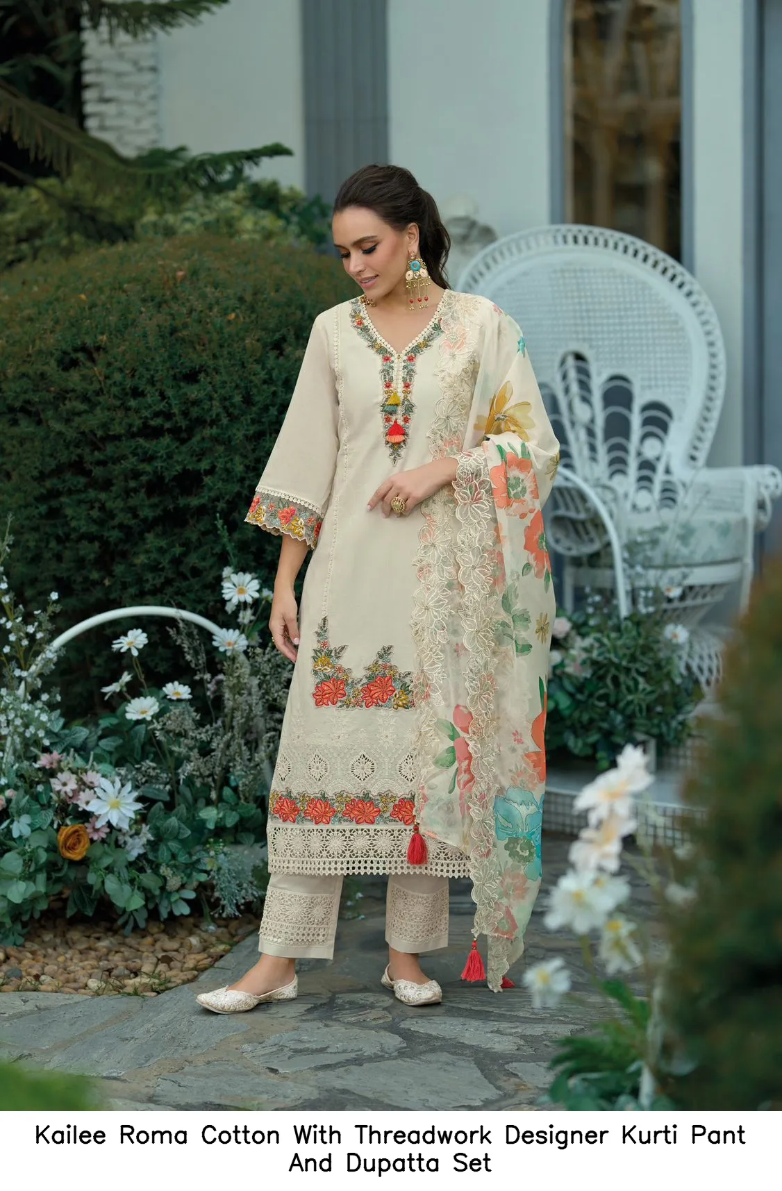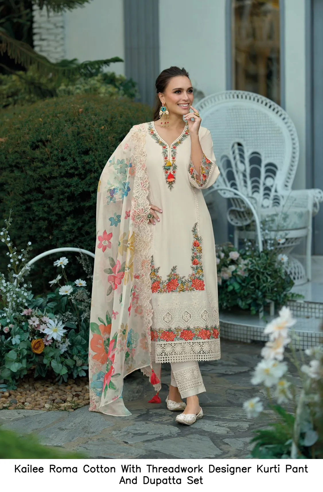 Kailee Roma Cotton With Threadwork Designer Kurti Pant And Dupatta Set