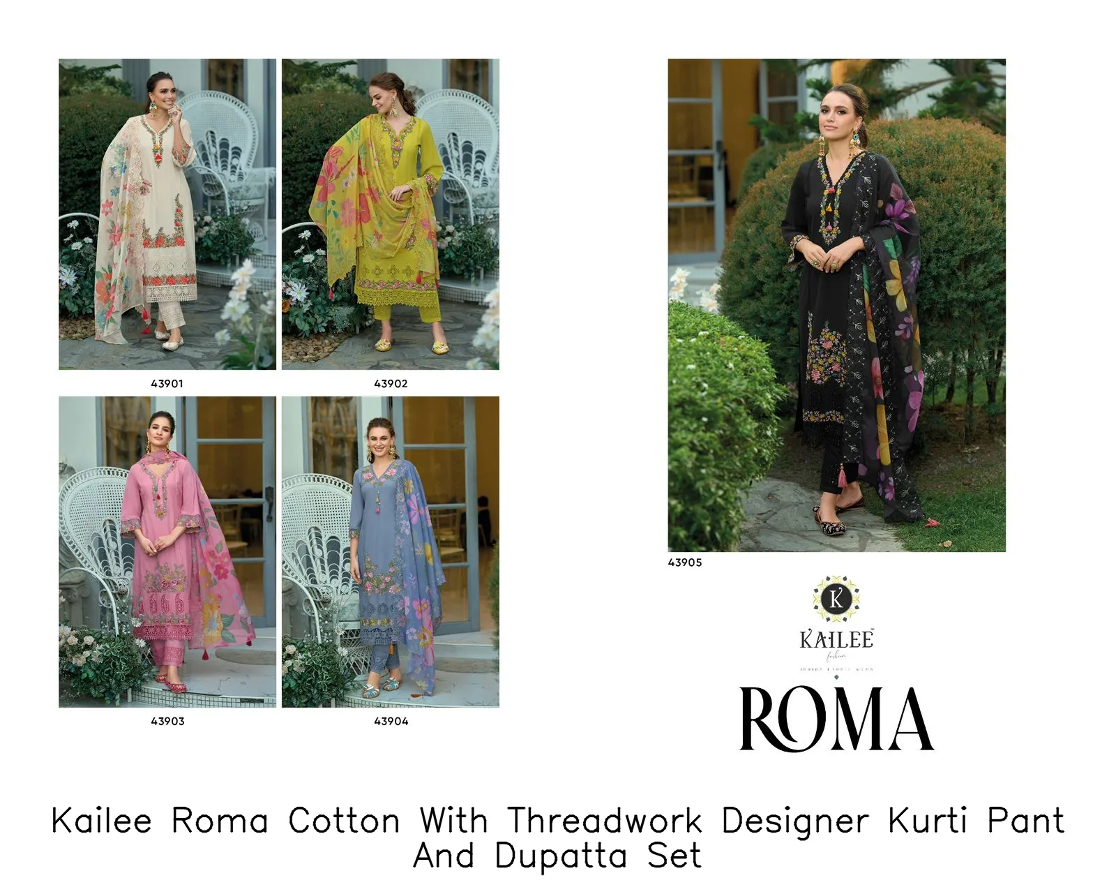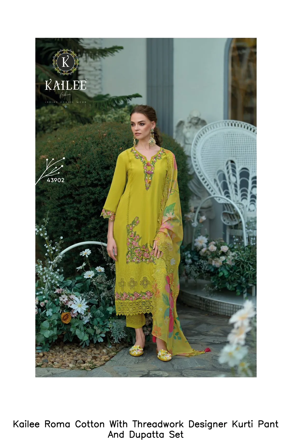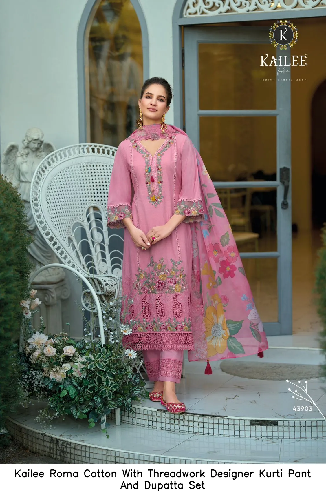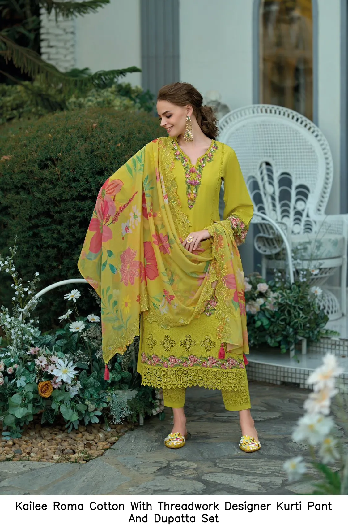 Kailee Roma Cotton With Threadwork Designer Kurti Pant And Dupatta Set