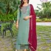 The bottom of the suit set features fancy embroidery work, adding a touch of traditional charm to the ensemble. The intricate embroidery enhances the overall look of the outfit.