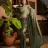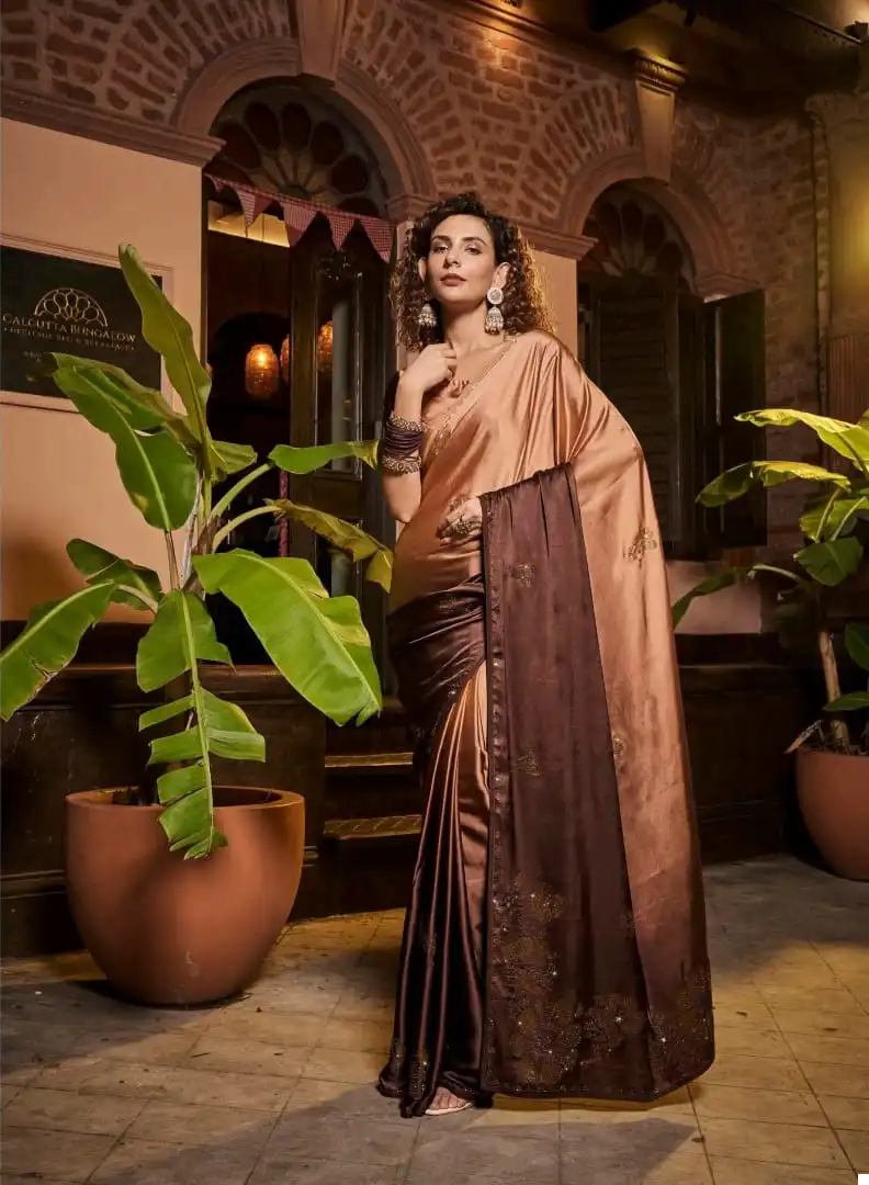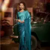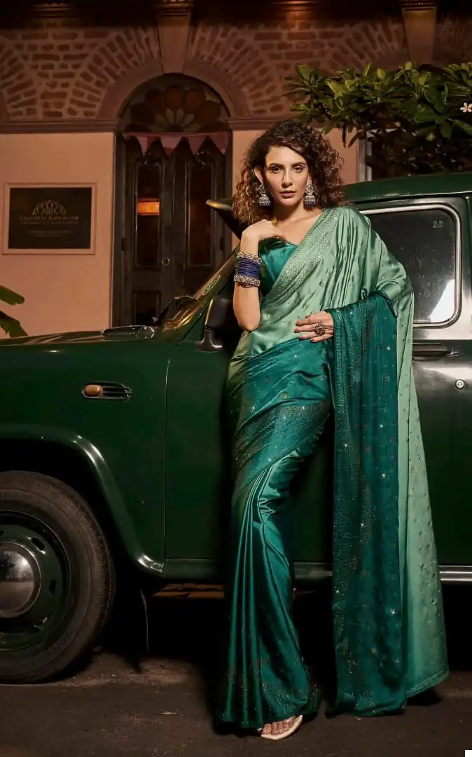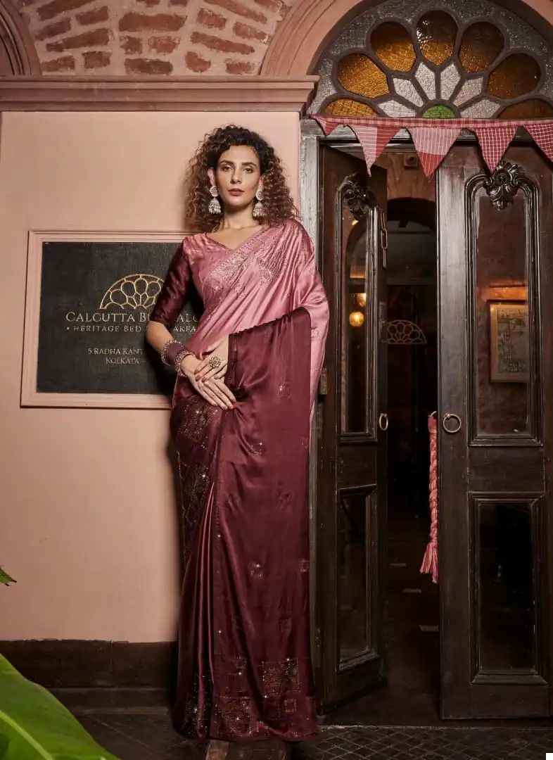 The saree described is made from a combination of satin and georgette fabrics, likely giving it a smooth texture with a slight sheer effect. Ombre refers to the gradual blending of one color hue to another, usually moving tints and shades from light to dark. This description suggests a contemporary style saree, which might be targeted to buyers looking for modern and stylish designs in traditional attire. The “fancy” blouse could indicate a more decorative and possibly embellished design to complement the saree. The set-to-set availability indicates this might be aimed at retailers or bulk purchasers.