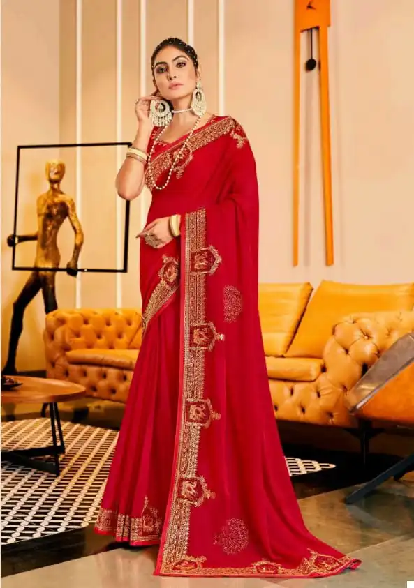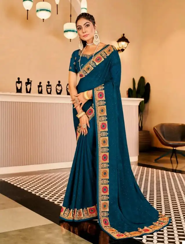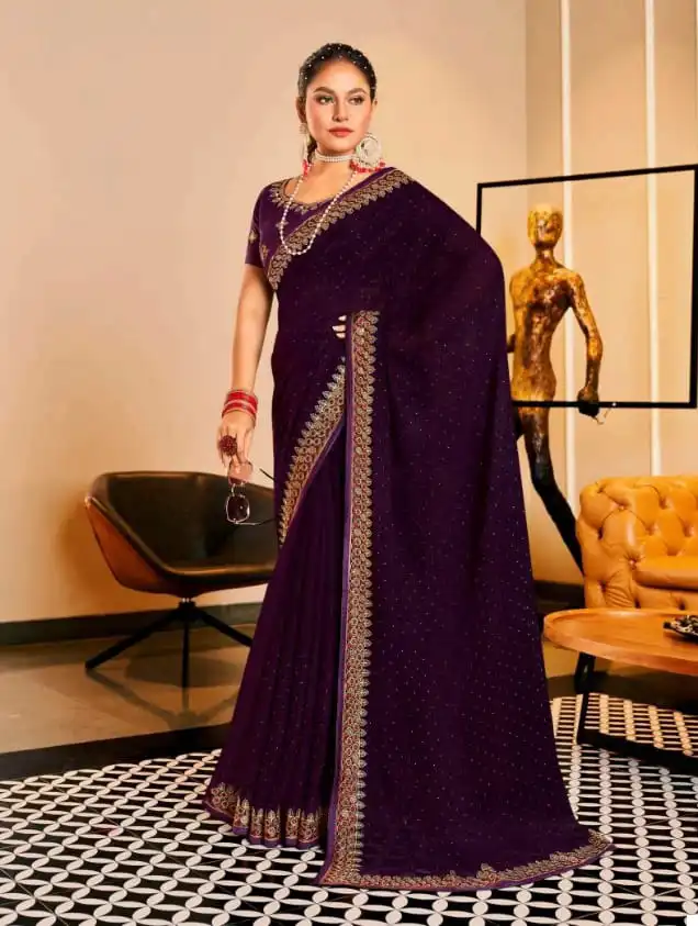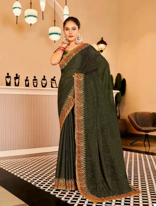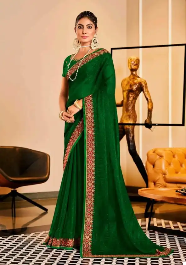 Embrace the allure of modern elegance with Vardan Ethnic’s Blooming Shimmer Fabric Saree, priced at 1599 per piece. This collection, consisting of six exquisite pieces, is a celebration of contemporary style and dazzling craftsmanship, perfect for those who love to stand out with a touch of glamour.