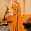Blouse: Complementing the saree is a fancy blouse piece that elevates the ensemble’s overall charm. The blouse can be tailored to your specific style and fit, allowing for a customized and unique look that matches the saree’s elegance.