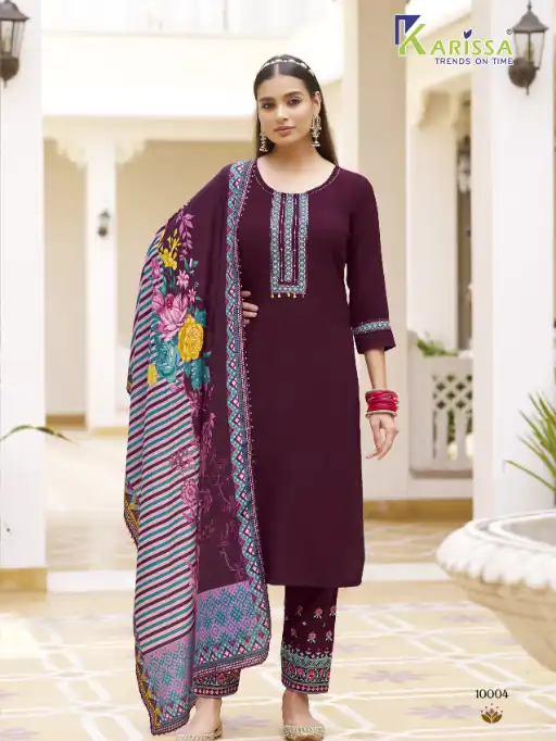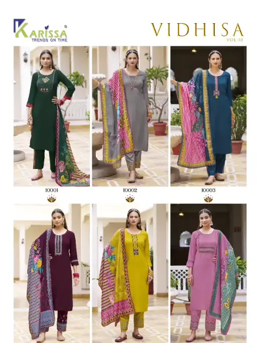 Buy Karissa Vidisha Vol-10 stitched rayon kurti sets with digital print dupattas at a wholesale rate.