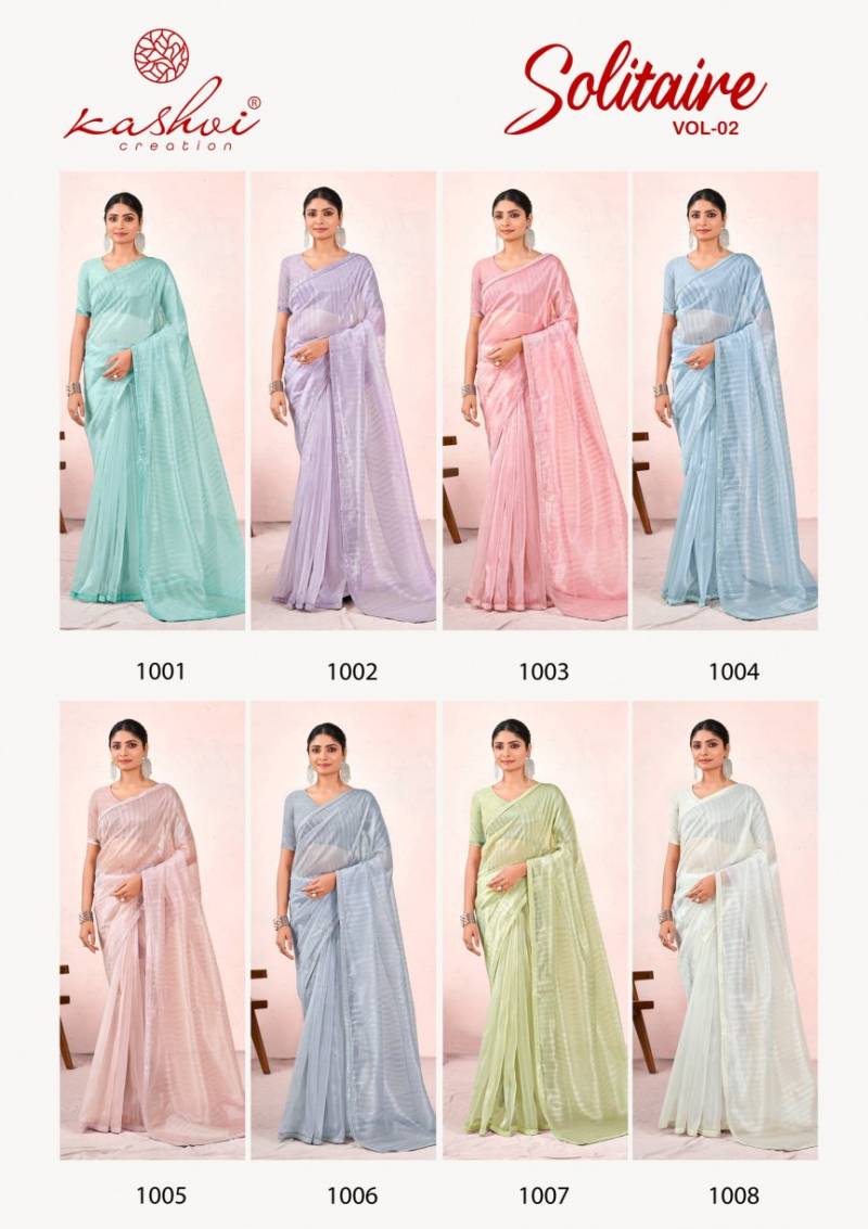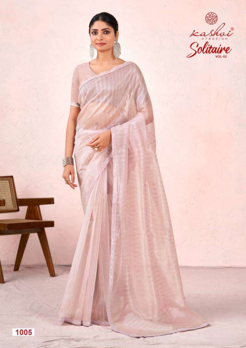 Kashvi Solitaire Vol 2 collection, featuring premium organza silk sarees adorned with exquisite cut work and Swarovski borders. Each piece blends modern charm with timeless tradition, making it a perfect addition for festive wear, weddings, and upscale ethnic styling.
