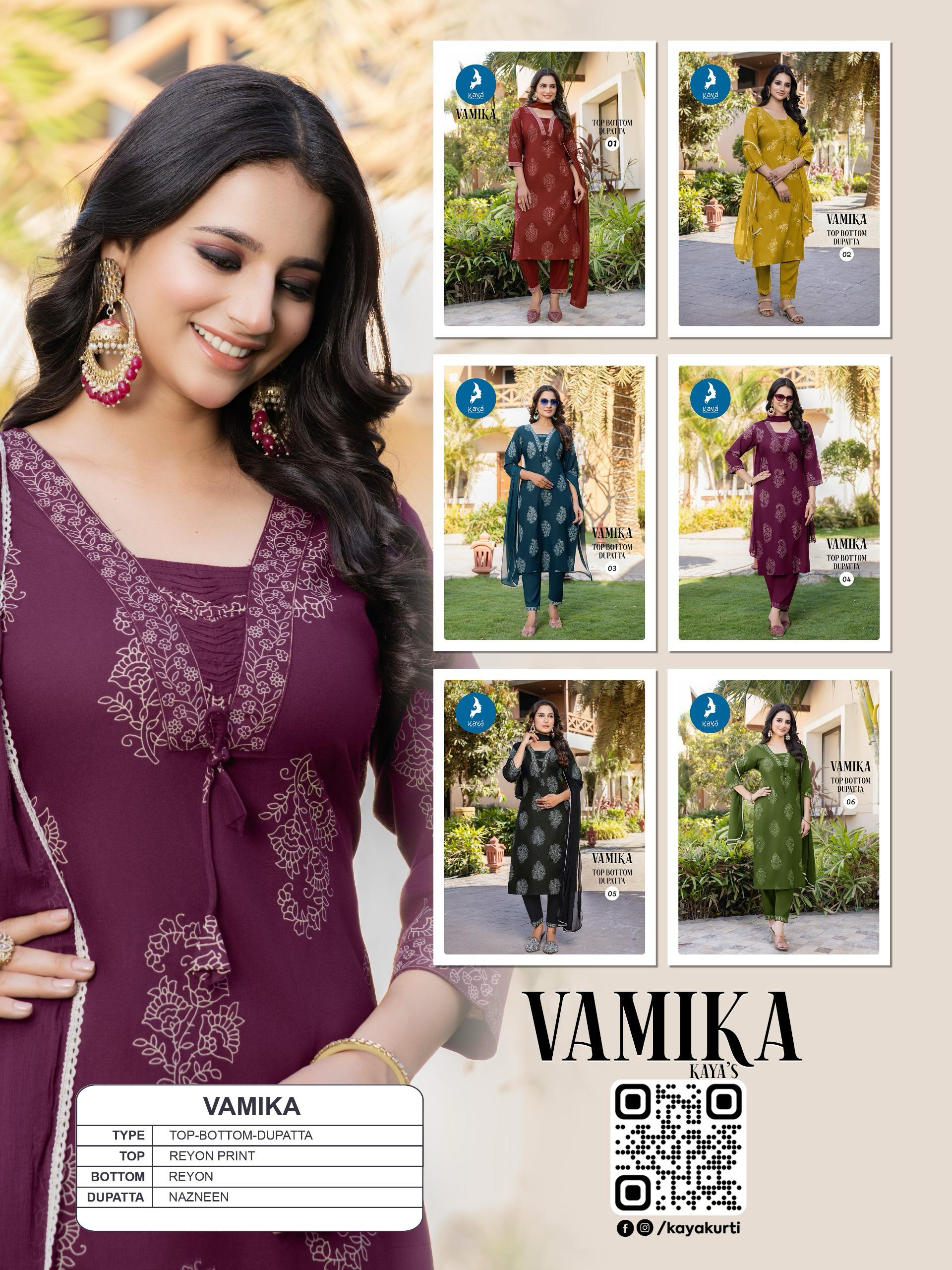 Kaya Kurti Vamika 3 Piece Rayon Straight Cut Kurti with Nazneen Dupatta Wholesale Catalog.