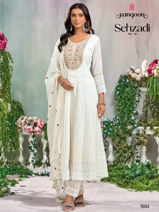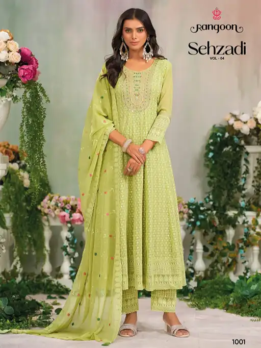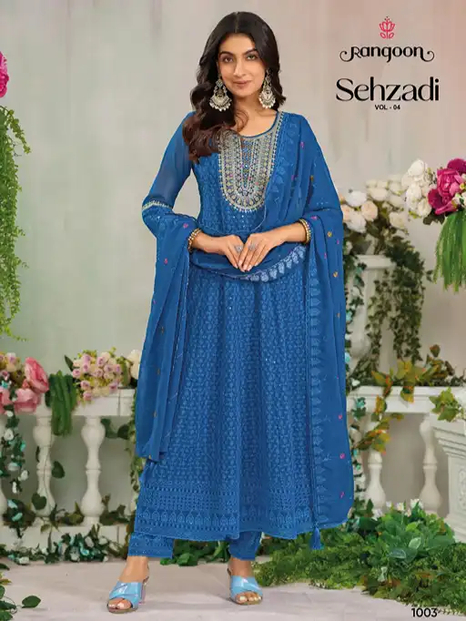 Shop Kessi Rangoon Sehzadi Vol 4 georgette suits with khatli mirror handwork & digital dupatta. Now available online at wholesale from Vardan Ethnic. (145 characters)