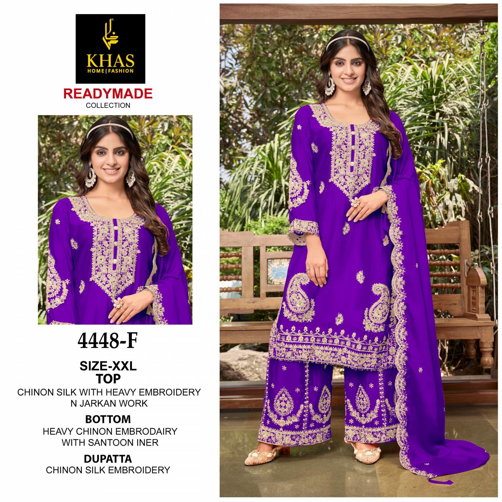 Khas 4448 D To F Wholesale Chinon Silk With Embroidery Pakistani Readymade Suit.