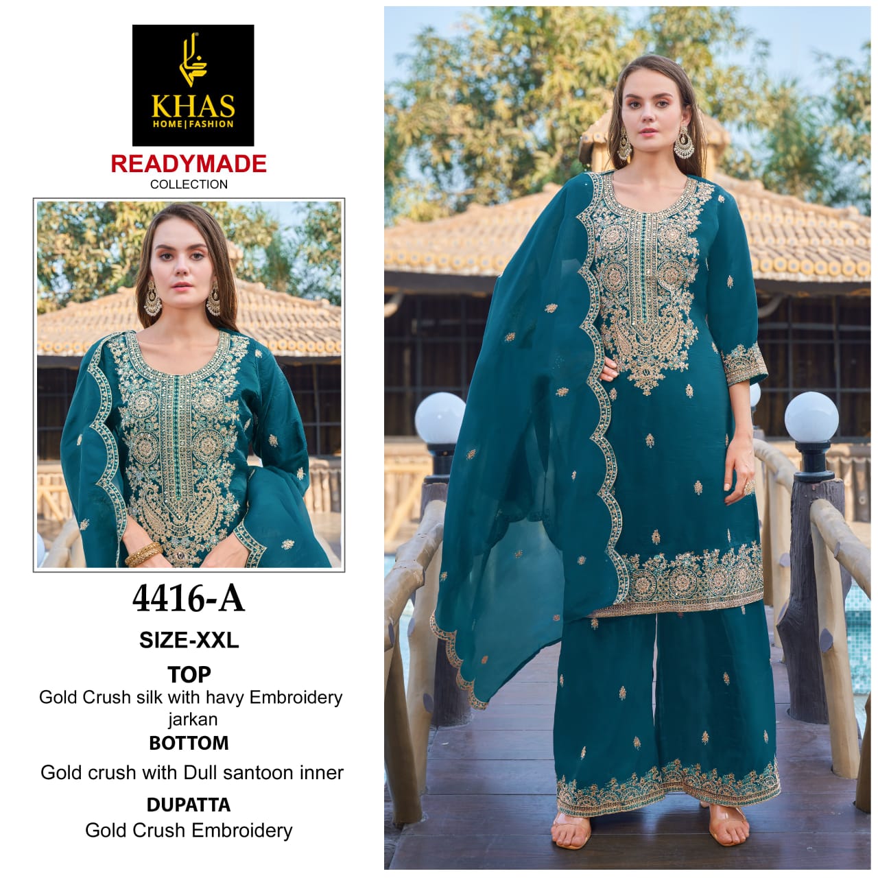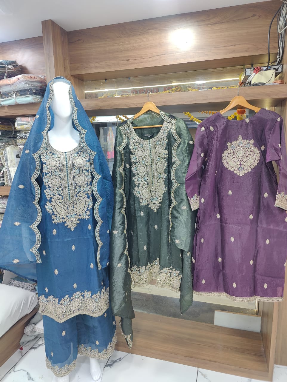 - Top: Premium Gold Crush Silk with Embroidery (Front & Back)