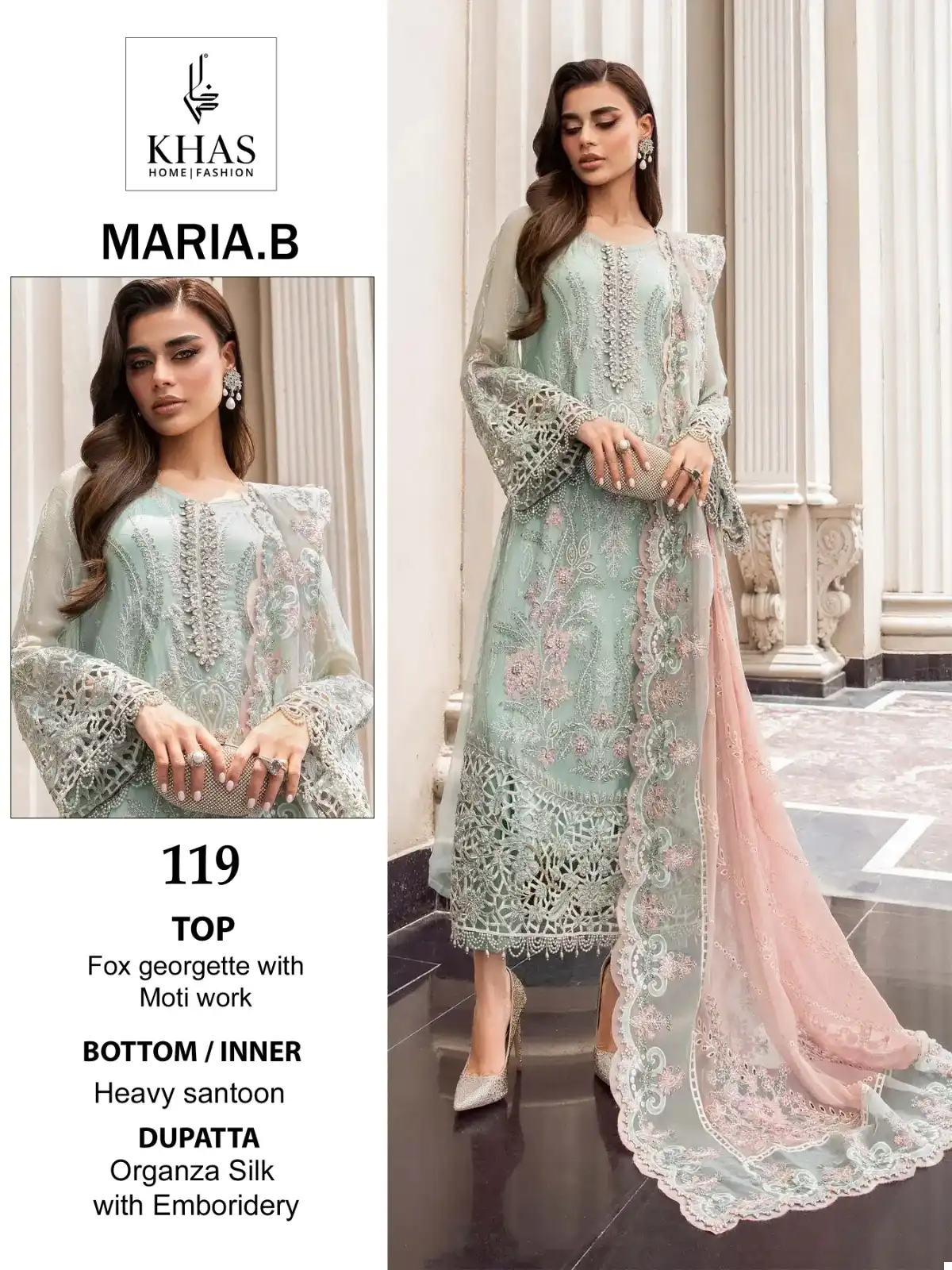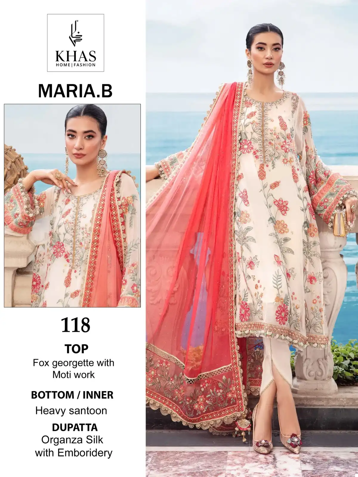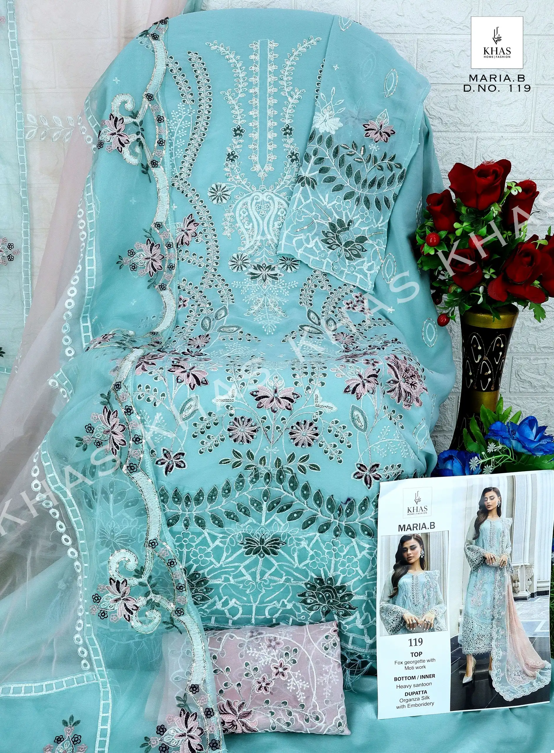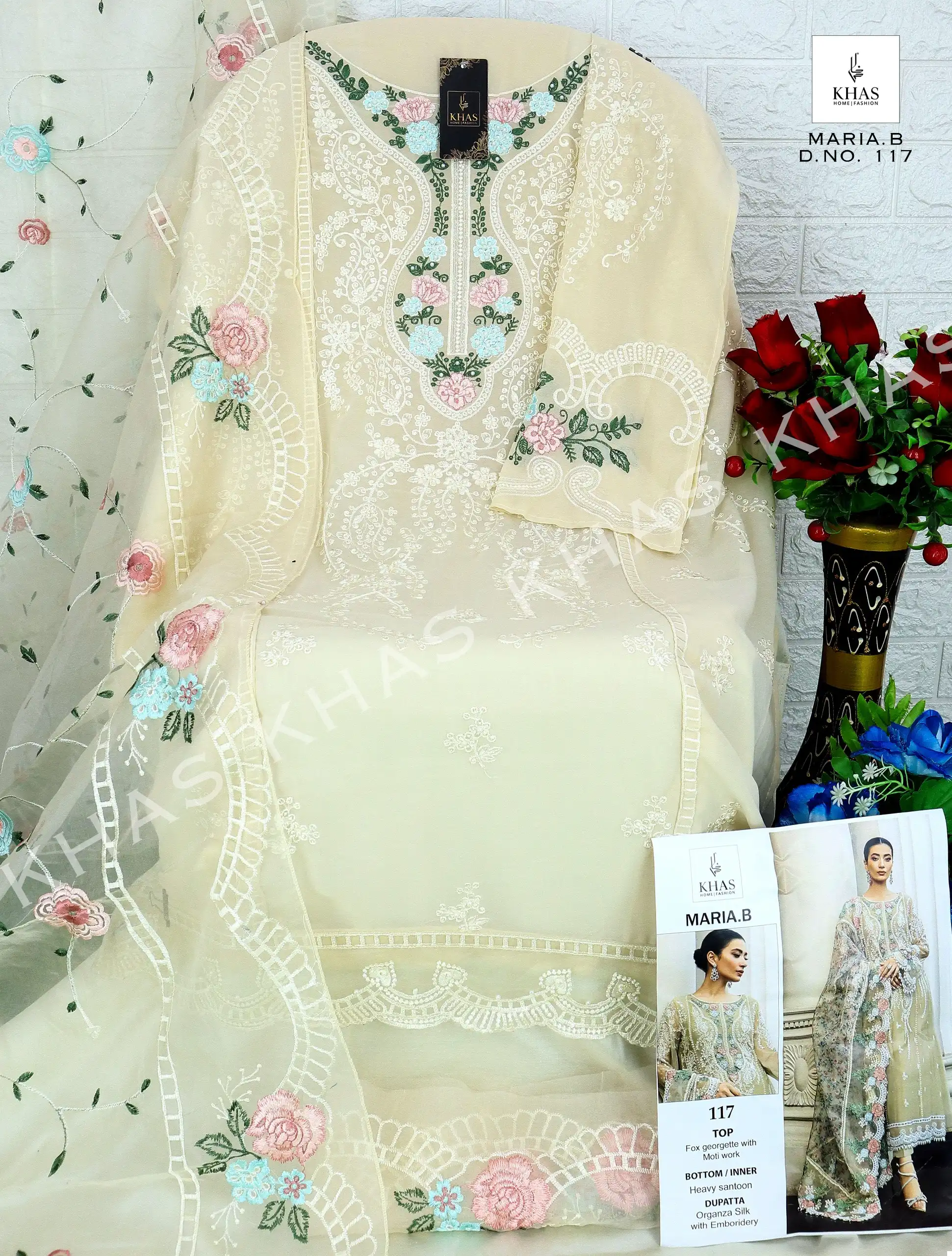 - Dupatta: The set includes an organza dupatta with embroidery, adding a delicate and refined touch to the ensemble.