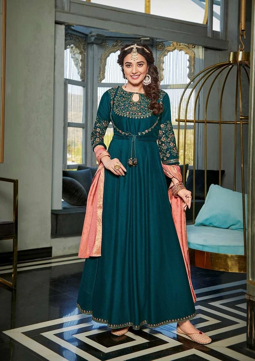 This elegant salwar suit set features a top made from fancy viscose with half inner lining, adorned with intricate embroidery and khatli work. It is complemented by a pure viscose jacquard dobby dupatta with matching embroidery and khatli work. This set is perfect for festive occasions, weddings, and special events, offering a luxurious and sophisticated look.