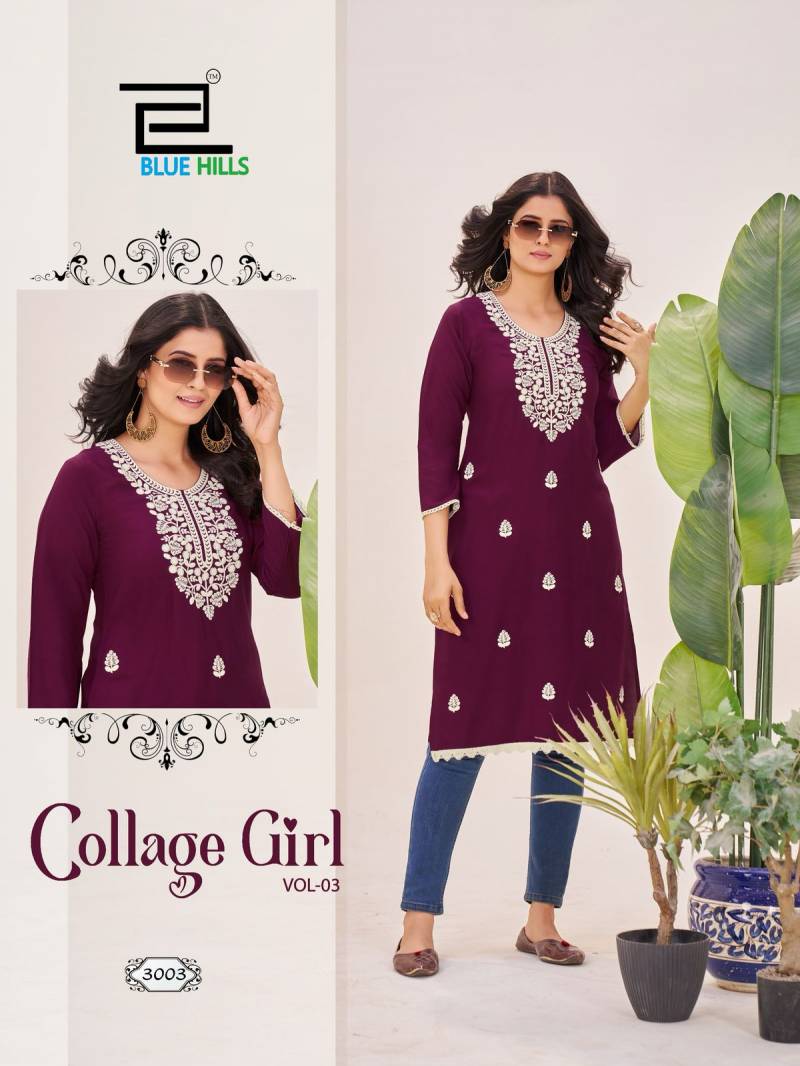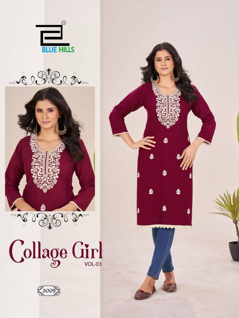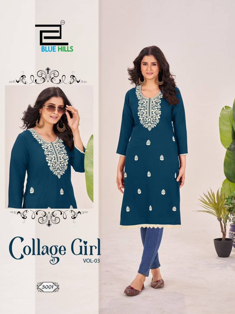 Blue Hills College Girl Vol 3 Rayon Embroidery Kurti Catalog.