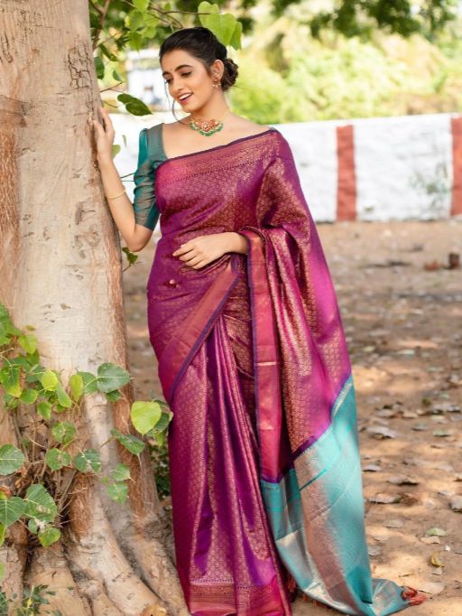 Blouse: Contrast exclusive jacquard border blouse, perfectly complementing the saree.