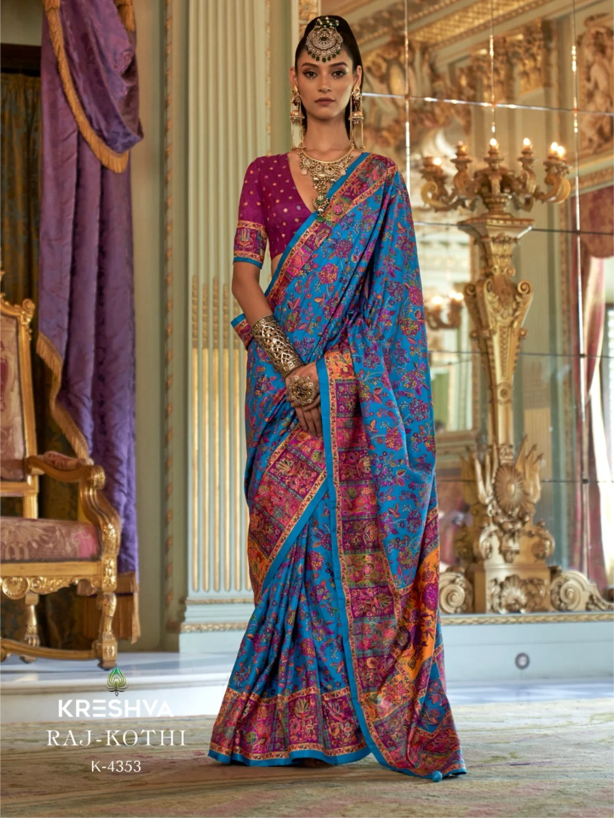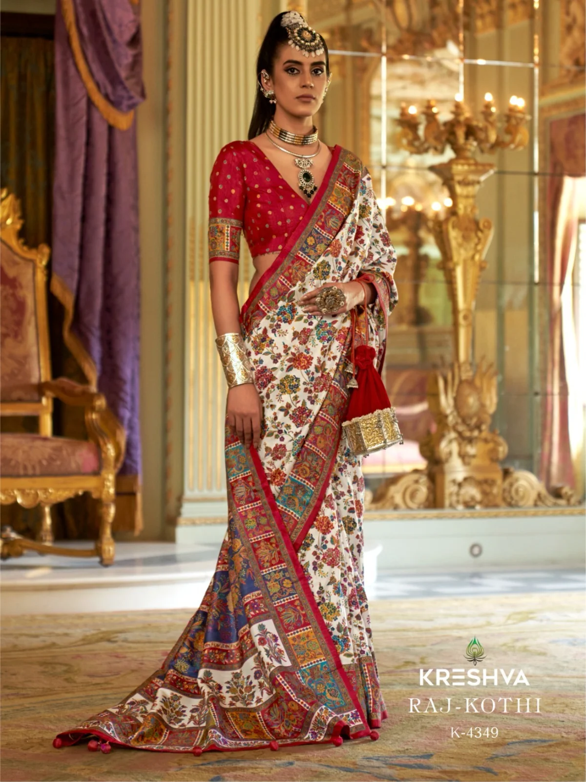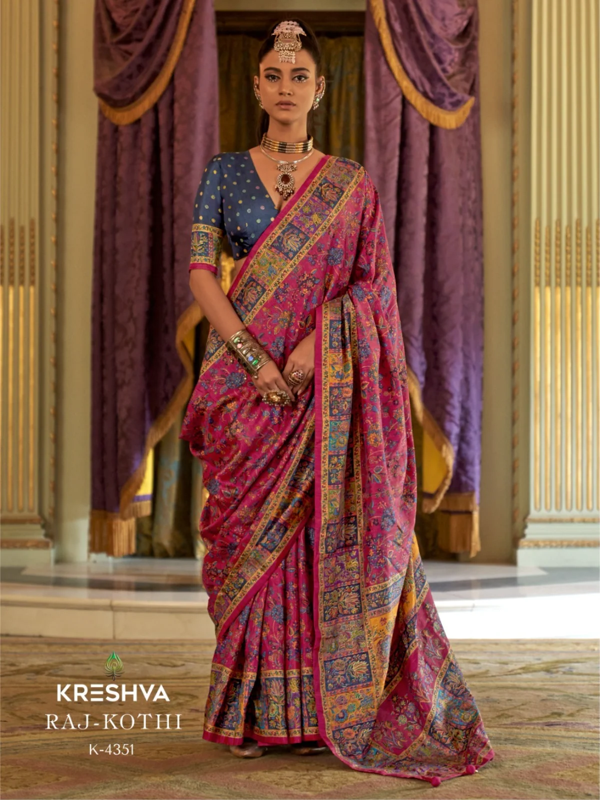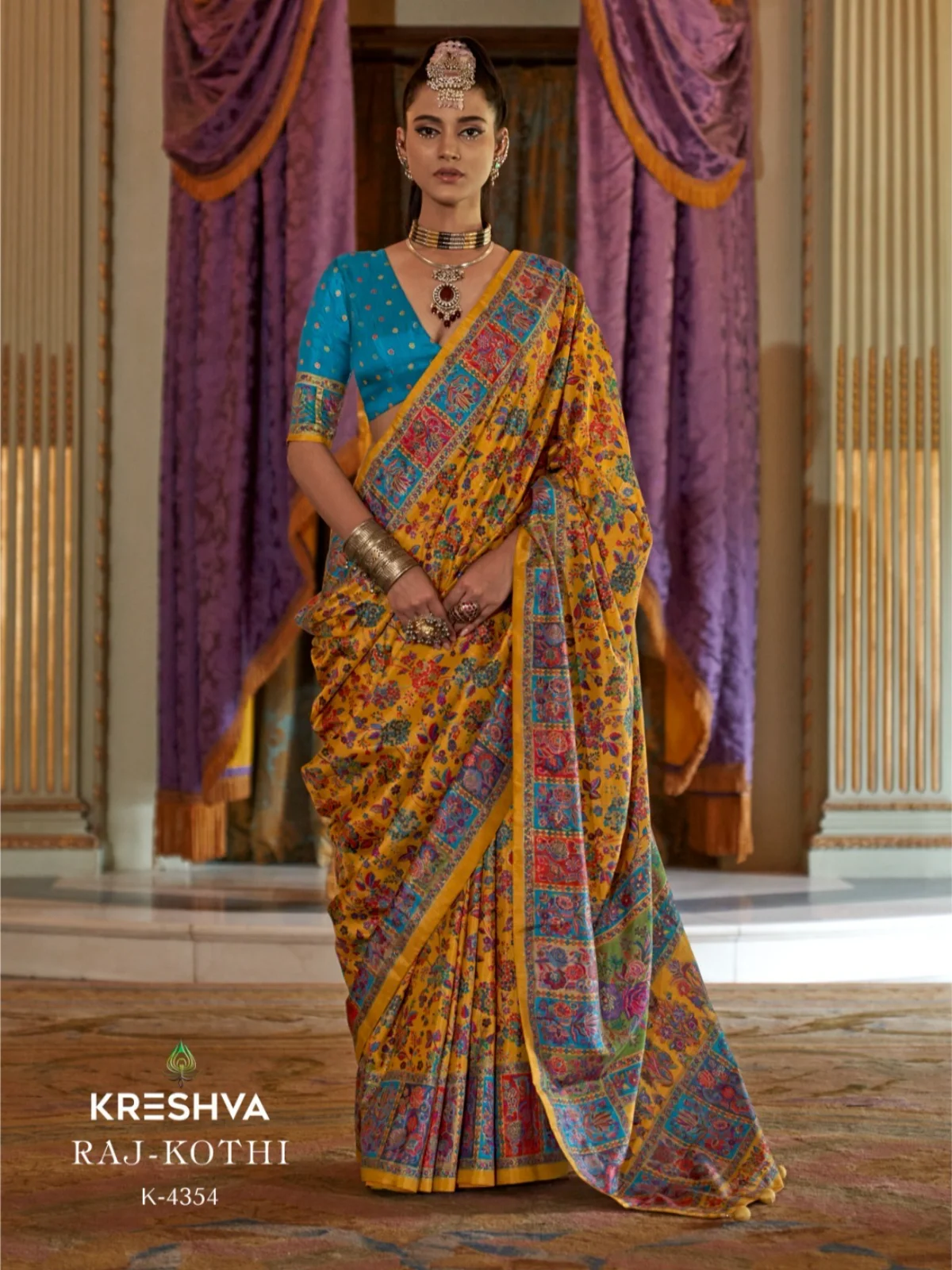 - Introducing the Kreshva Raj-Kothi Saree Collection, designed for everyday elegance and comfort. Crafted in high-quality Super 801 PV Silk, these sarees feature H.B. luxury prints with a smooth marmo finish, offering a refined look with easy drape and durability.