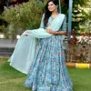 - Fabric & Work: The accompanying Chinnon blouse is adorned with matching Sequins & Position Print Work, perfectly complementing the lehenga for a cohesive and harmonious look.
