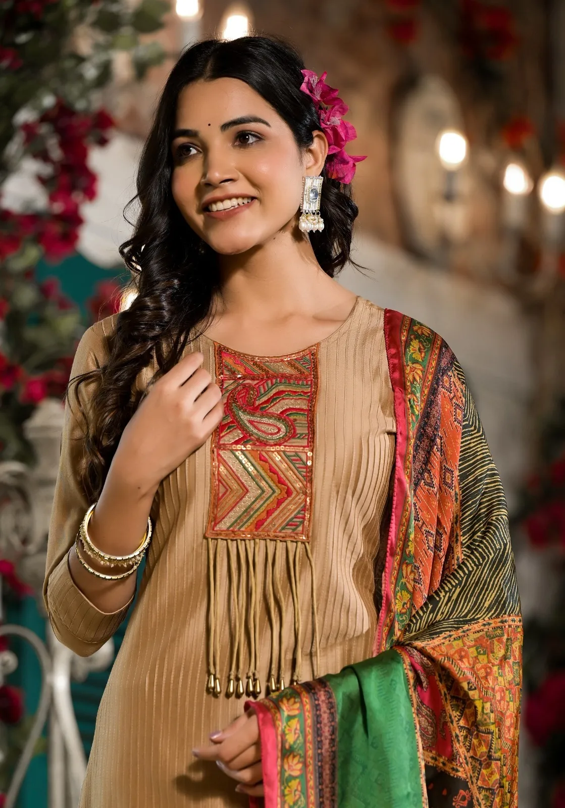 | Fabric | Silk Top with Pintuck Fabric and Embroidery Fancy Hangings And Graceful Digital Dupatta |