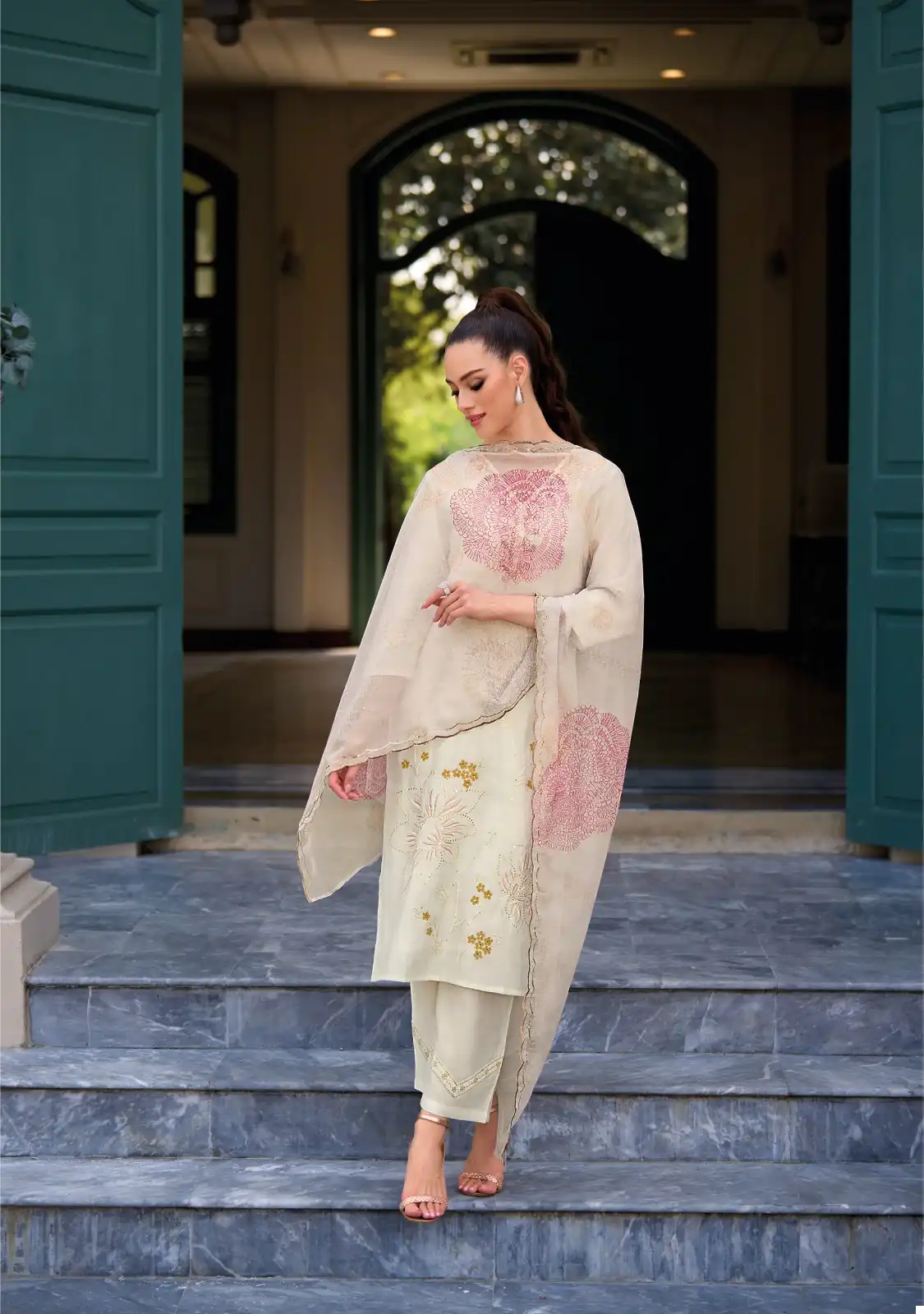 - Dupatta: Complete your ensemble with the Organza Digital Print Dupatta featuring scalloped edges, adding a touch of grace and sophistication. The dupatta enhances the overall look of the outfit and offers versatility in styling.