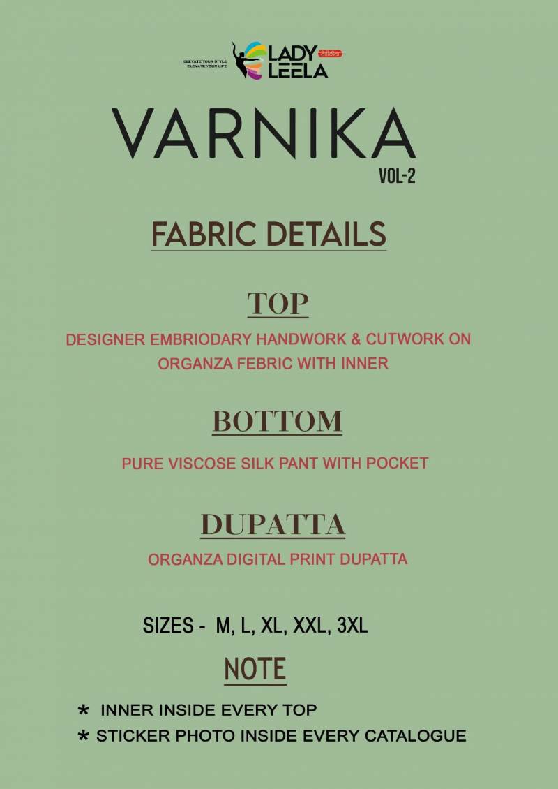 Shop Lady Leela Varnika Vol 2 Organza Kurti Sets with Handwork, Cutwork & Digital Print Dupatta at ₹1395 + GST. Available in 4 elegant designs and sizes M to 3XL.