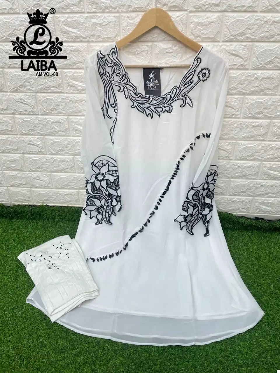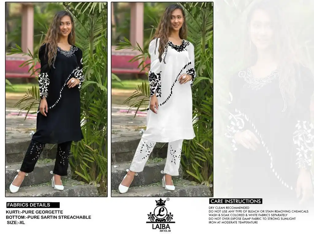 - Pakistani Kurti Pant Ensemble: The Laiba Am Vol-88 catalog features perfectly coordinated Pakistani Kurti Pant sets, offering a contemporary twist to traditional wear. The kurtis are intricately designed, and the pants are tailored for a comfortable yet fashionable fit.