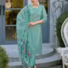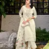 The suit set includes pure viscose pants that are stitched with a unique pattern, adding a contemporary twist to the traditional ensemble. The pants provide comfort and style, making them a perfect match for the organza top.
