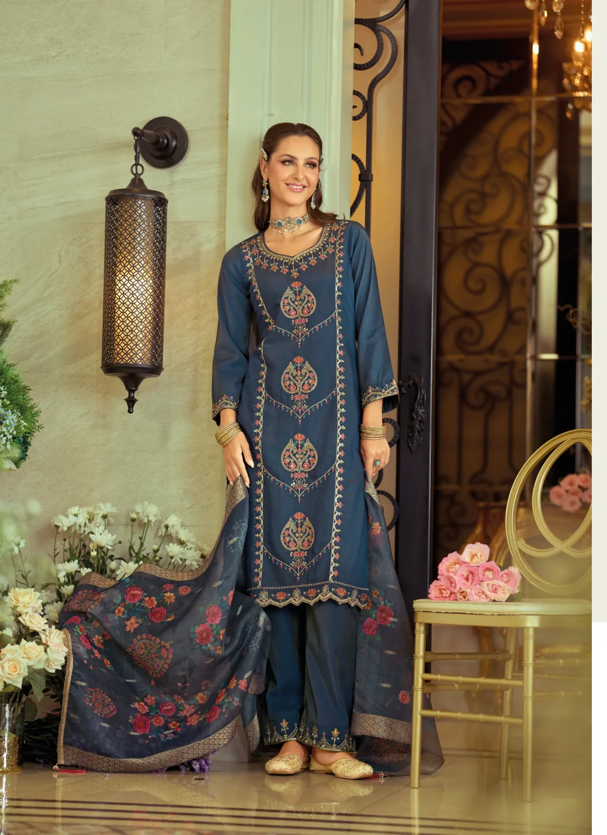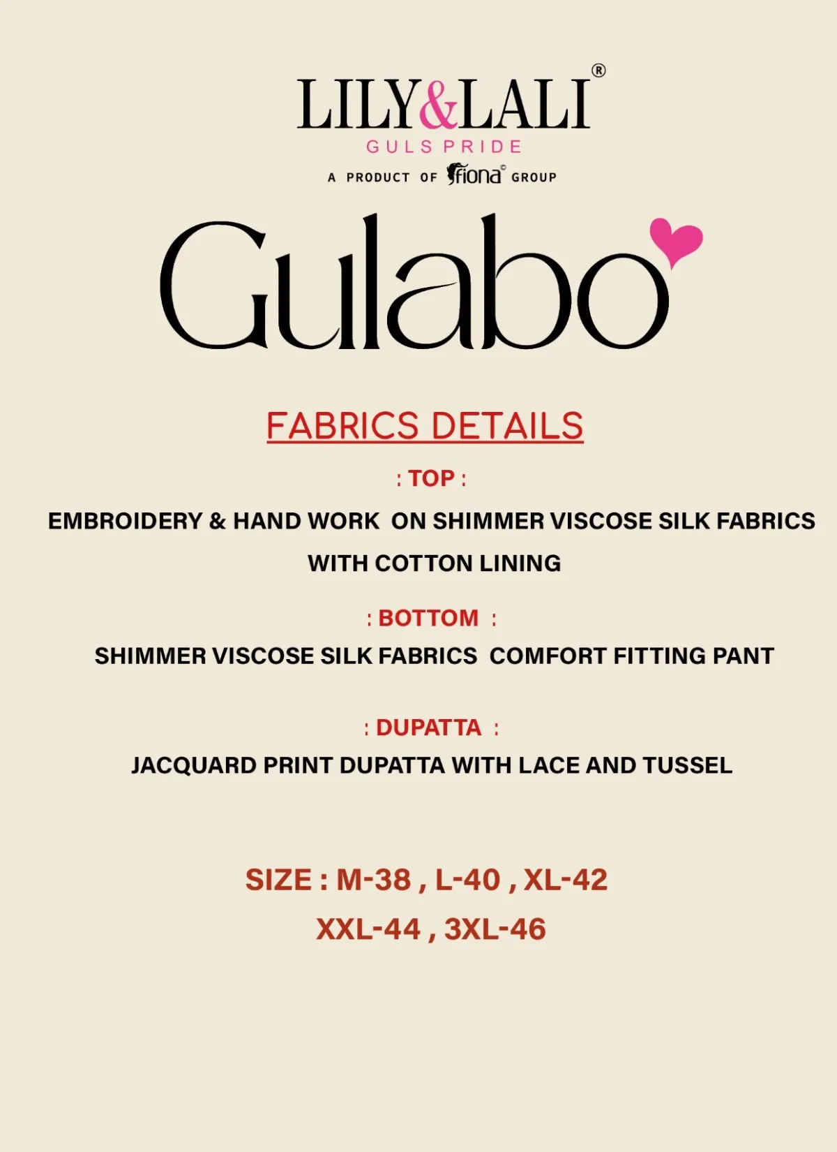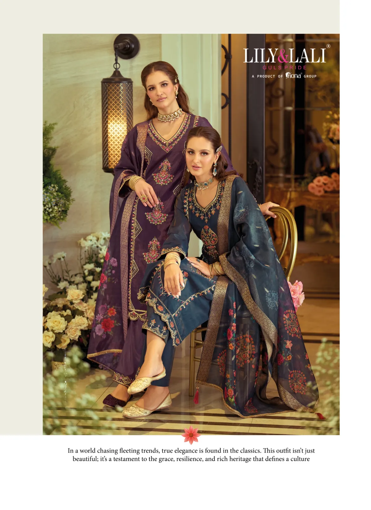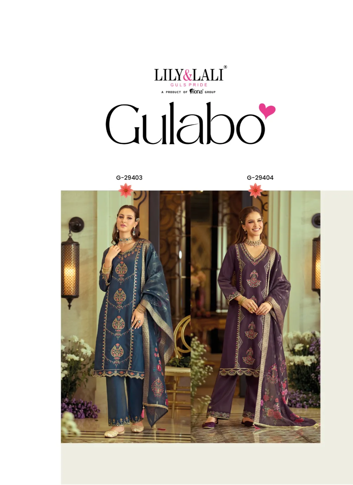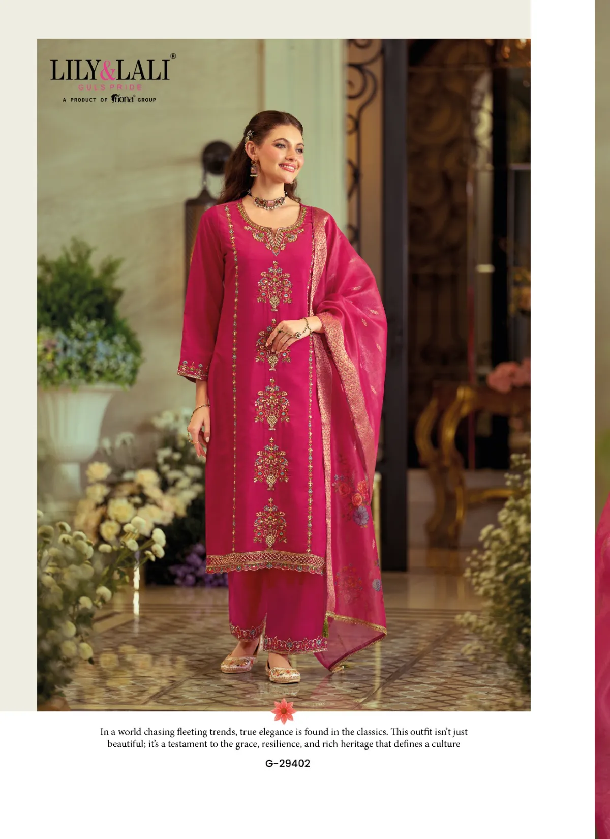 Step into timeless elegance with Gulabo by Lily & Lali, a refined ethnic ensemble that celebrates grace, comfort, and detailed craftsmanship. Designed under the Gul’s Pride line by Fiona Group, this suit set is perfect for women who appreciate understated luxury with a festive touch.