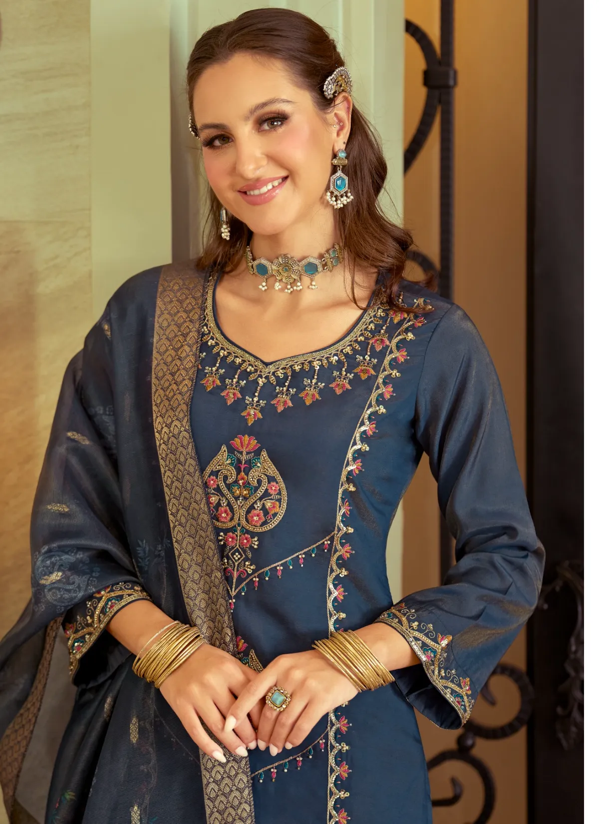 Crafted in shimmer viscose silk, the outfit features exquisite embroidery and handwork that elevates its royal appeal. The rich fabric drapes beautifully, while the comfortable fit ensures effortless wear for long celebrations.