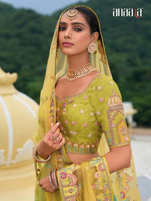 Buy Pastel Shaded Lime Yellow Australian Silk Traditional Wedding Lehenga online at wholesale rate. A luxurious circular lehenga with exquisite handwork and embroidery — perfect for weddings, engagements, and festive celebrations.