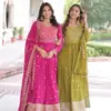 - Available in two stunning shades—Rani Pink and Mehendi Green—this readymade gown set offers a perfect blend of traditional craftsmanship and contemporary style at an unbeatable value.