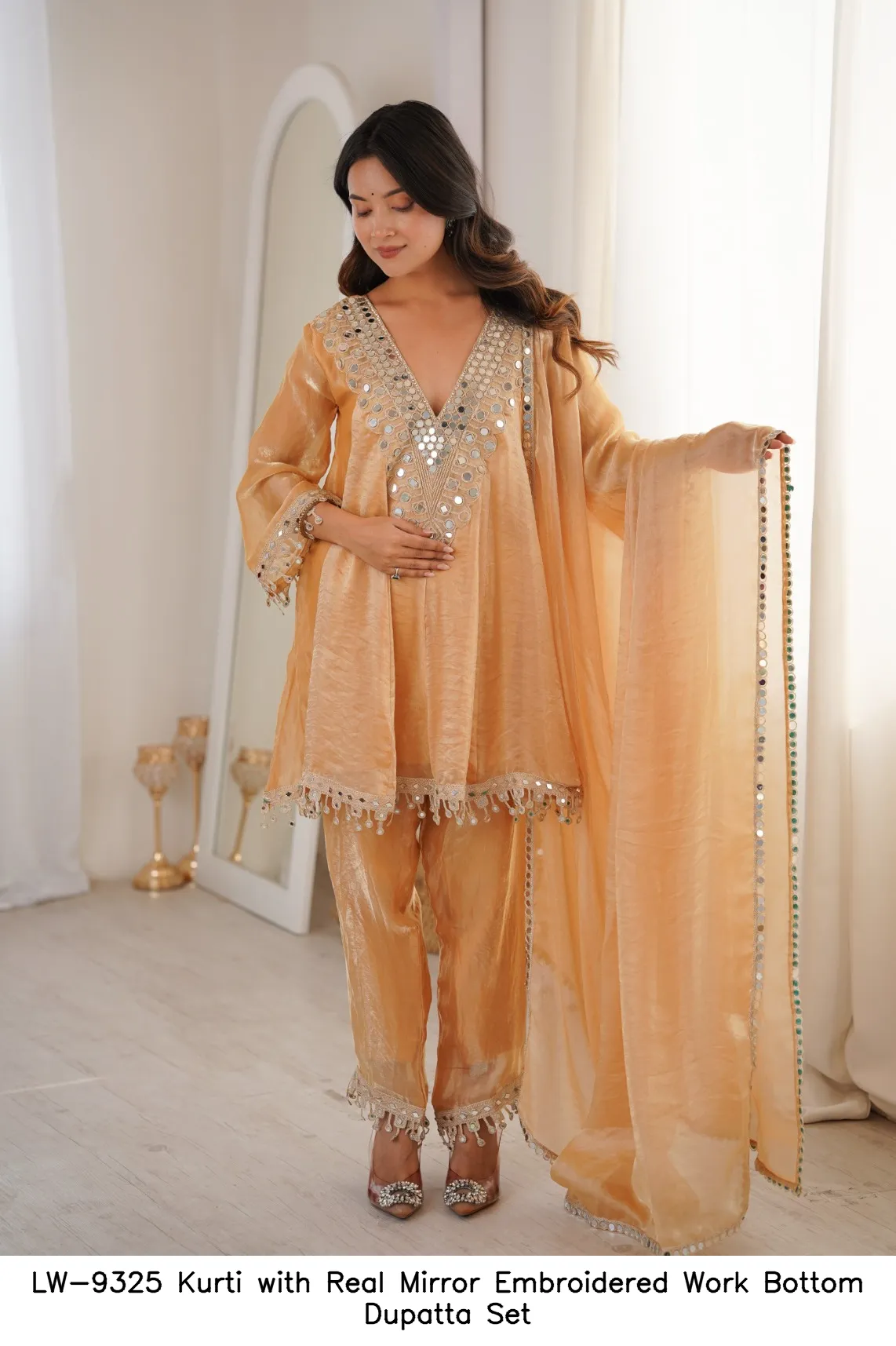 | Bottom | Fendy Fabric With Real Mirror With Coding Embroidered Lace work |