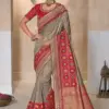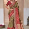 Looking for a wedding-perfect saree in rich tones and premium fabric? This M.N Designer Saree is crafted from premium pure Kanjivaram silk with Patola panel weaving, embellished with Gotta Patti and Khatli work on the border, making it ideal for grand occasions.