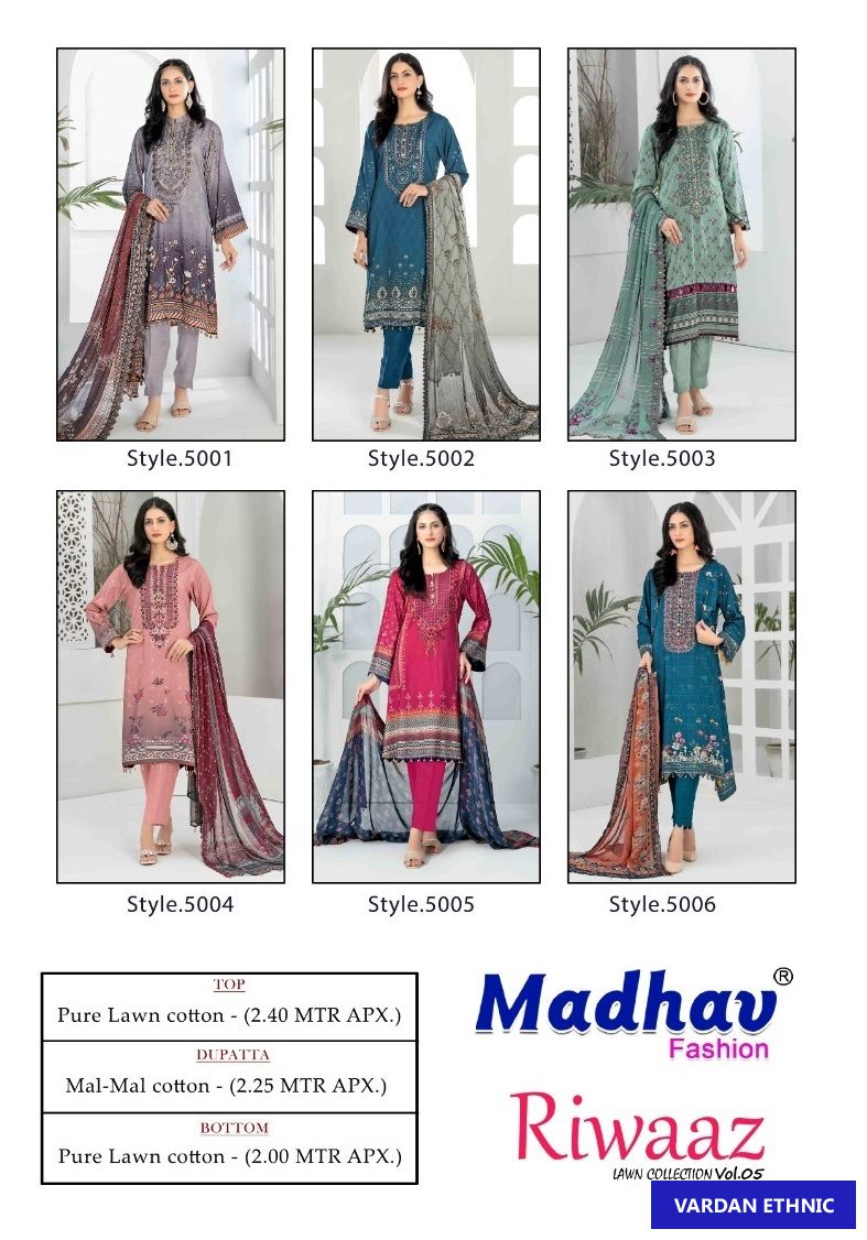 Madhav Riwaaz Vol 5 Lawn Cotton Wholesale Pakistani Salwar Suit Catalog 6 Pcs. We deal in Kurtis, Sarees, Dresses Materials, Leggings, and Designer Salwar Kameez.