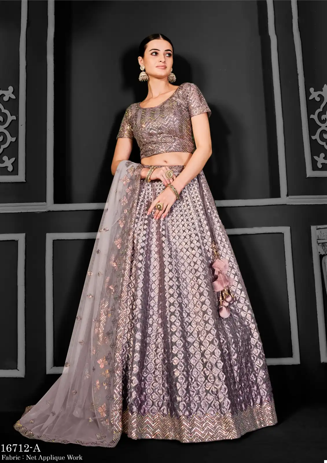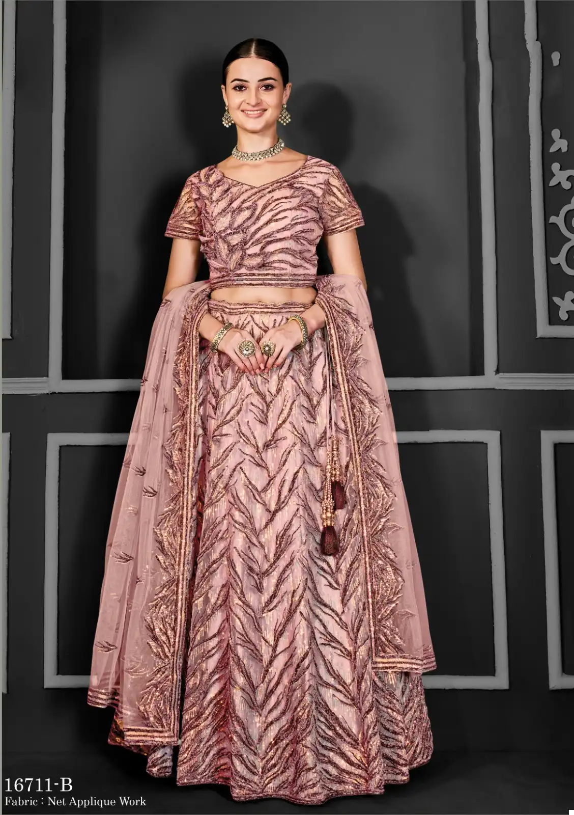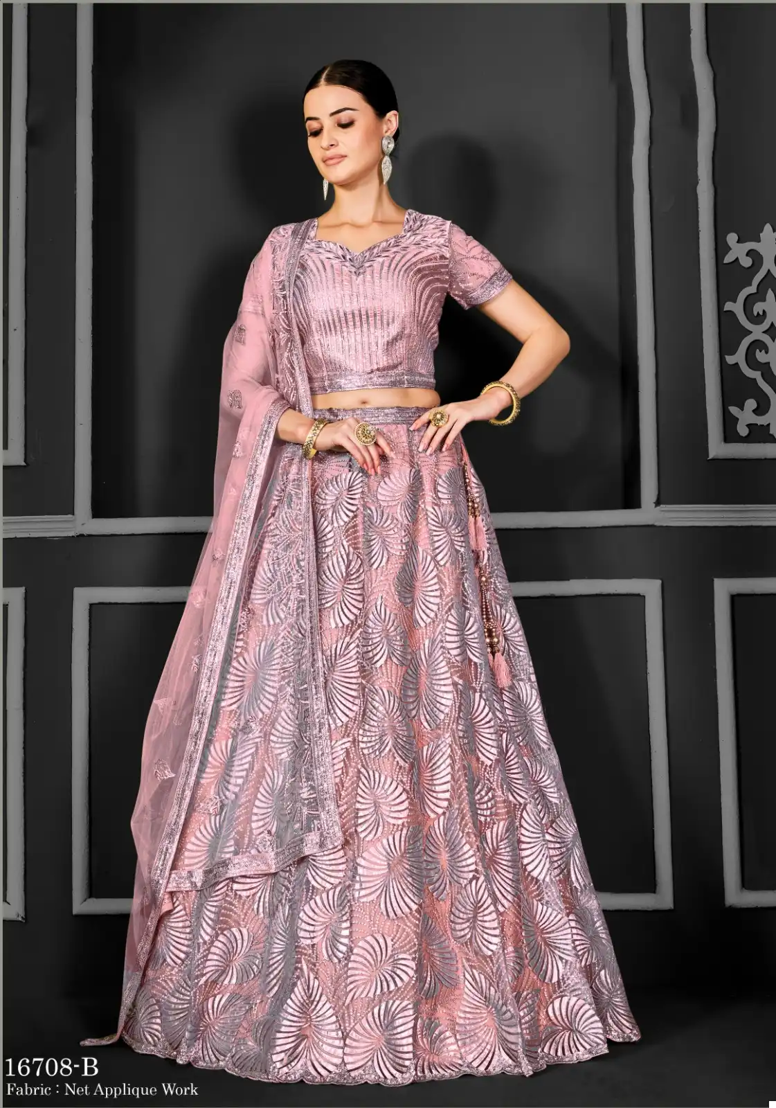 Lehenga: Crafted from premium quality net fabric, our lehenga features a flattering silhouette that accentuates your curves elegantly. The intricate cord floral sequence embroidery and applique work add a touch of sophistication and charm to the ensemble, making it perfect for weddings, receptions, and festive gatherings.