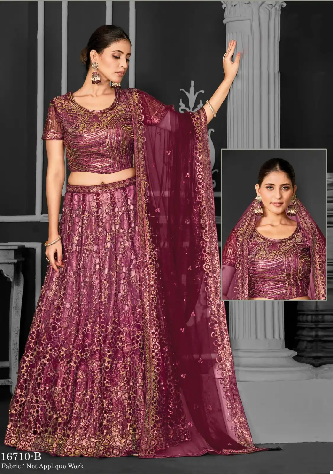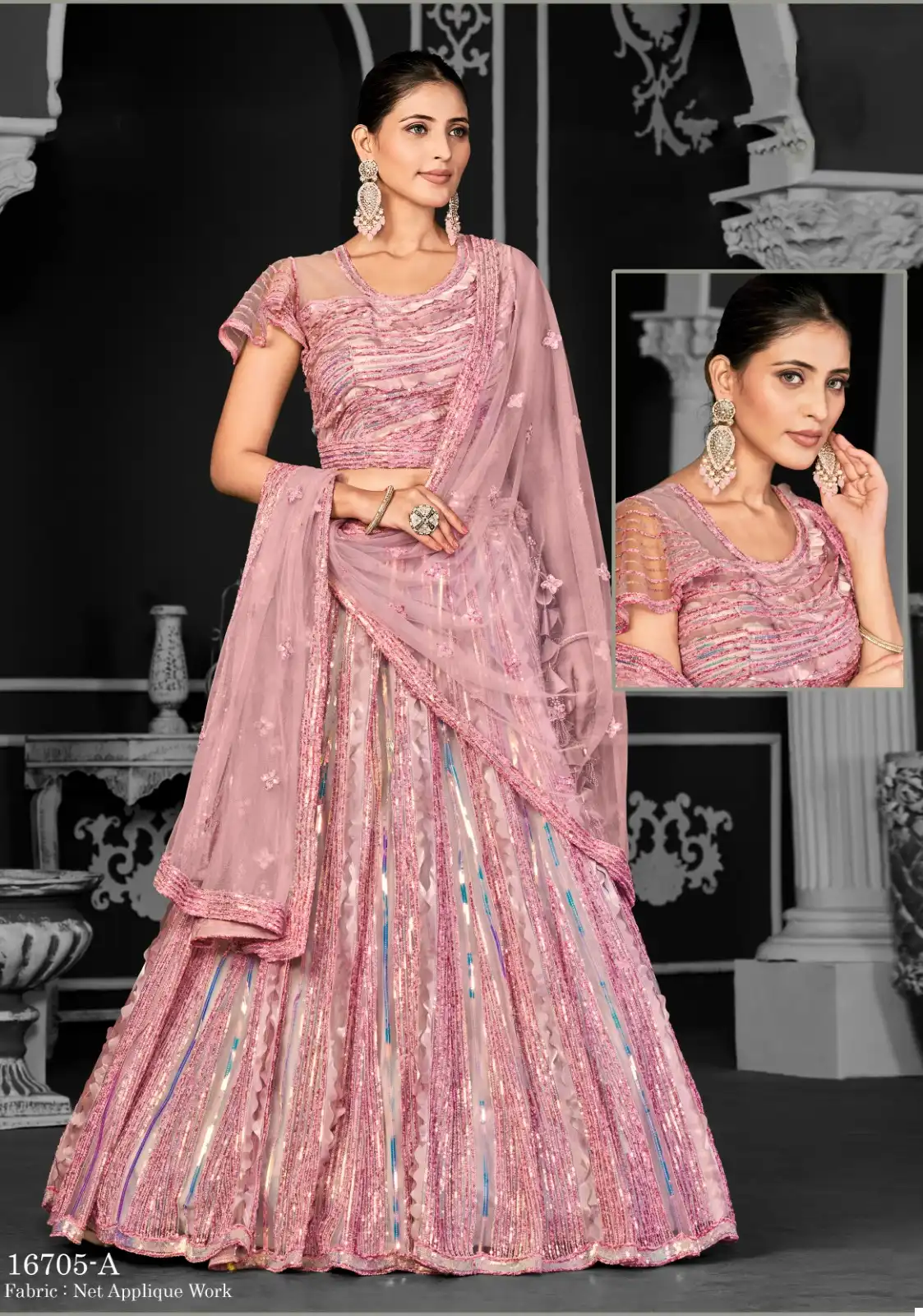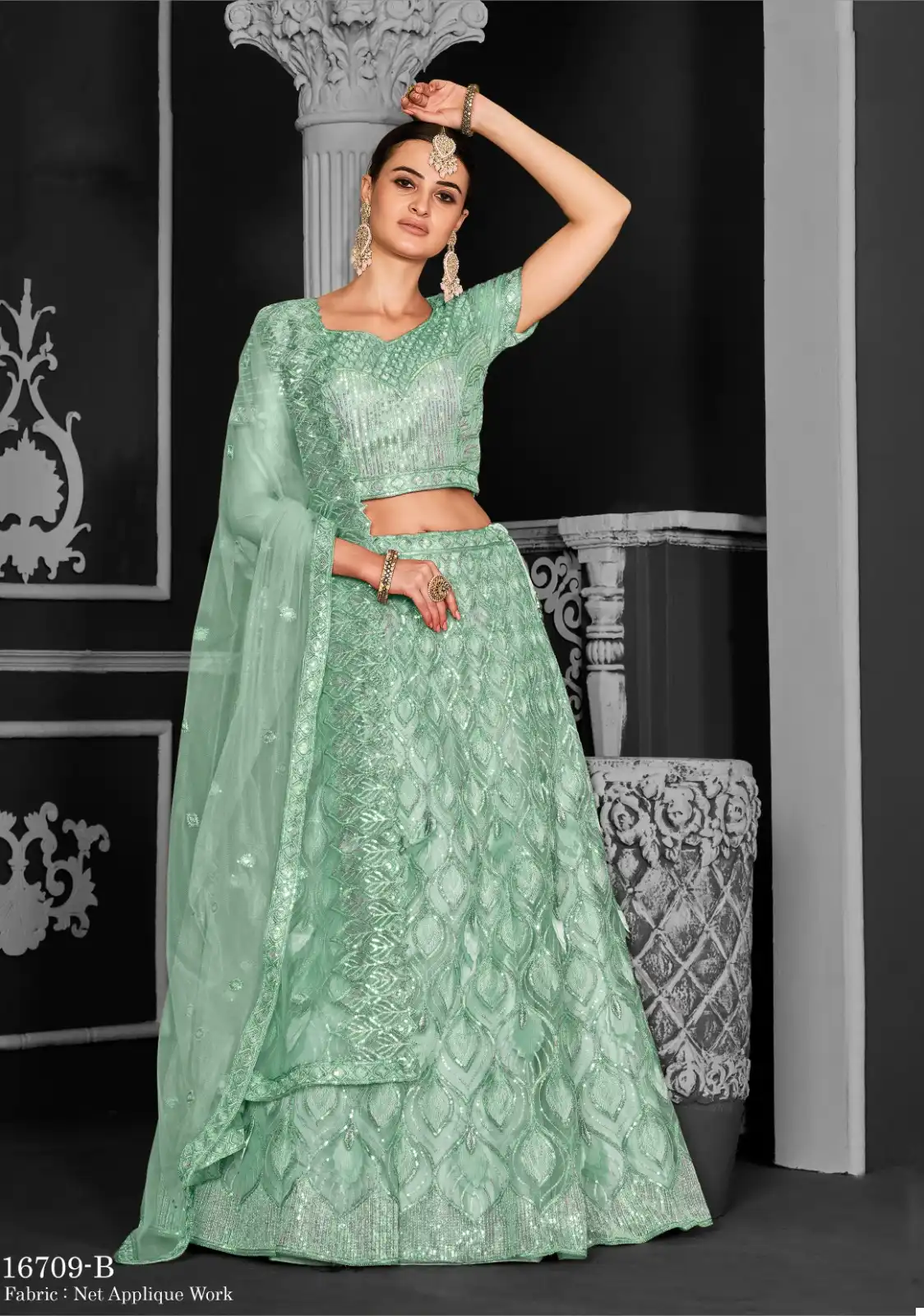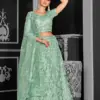 Lehenga: Crafted from premium quality net fabric, our lehenga features a flattering silhouette that accentuates your curves elegantly. The intricate cord floral sequence embroidery and applique work add a touch of sophistication and charm to the ensemble, making it perfect for weddings, receptions, and festive gatherings.
