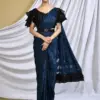 - The saree features a combination of Crepe Silk Satin, Pattern Georgette, Crepe Silk Georgette, and Silk Crepe Satin fabrics, providing a variety of textures and visual appeal.