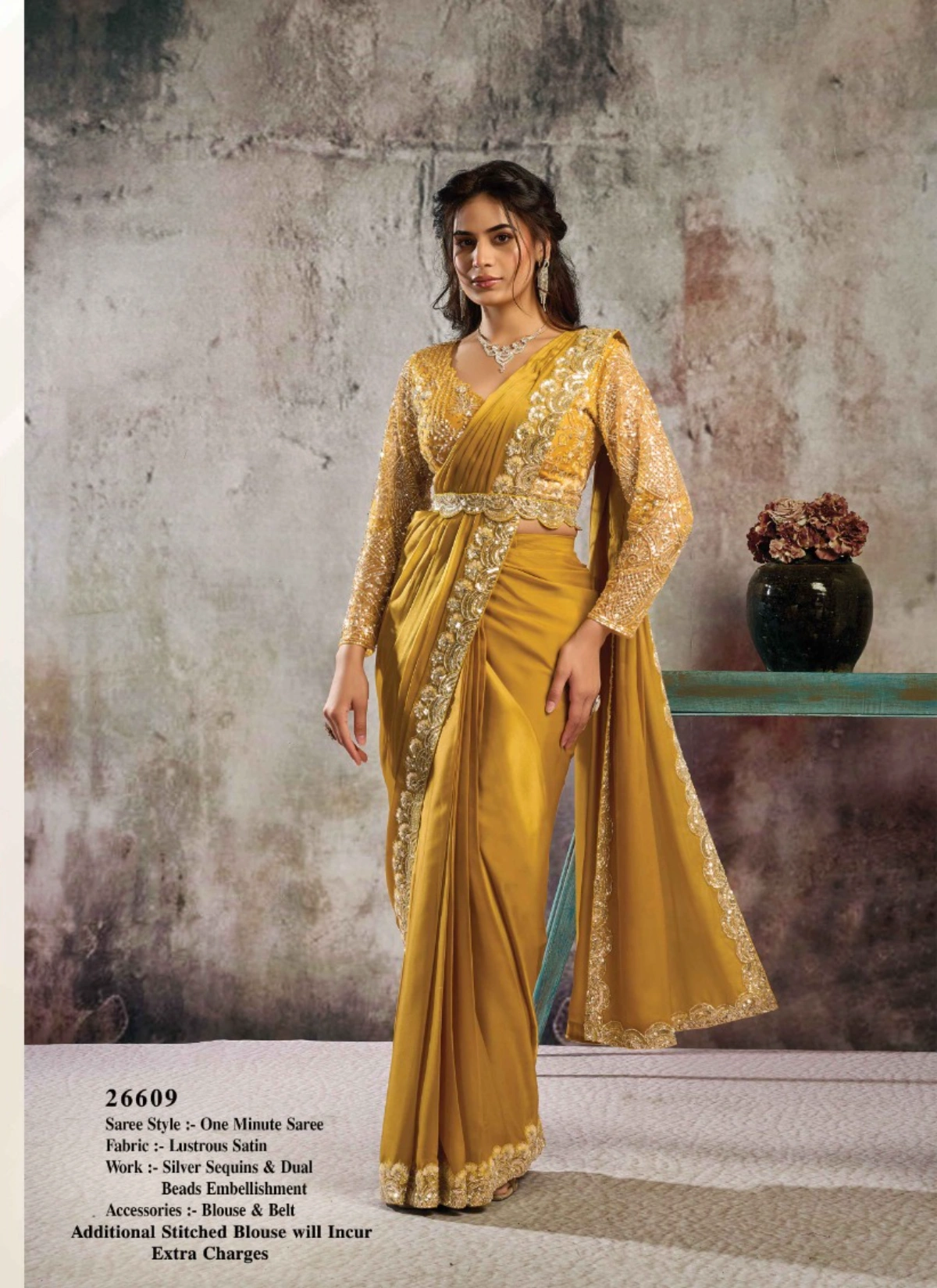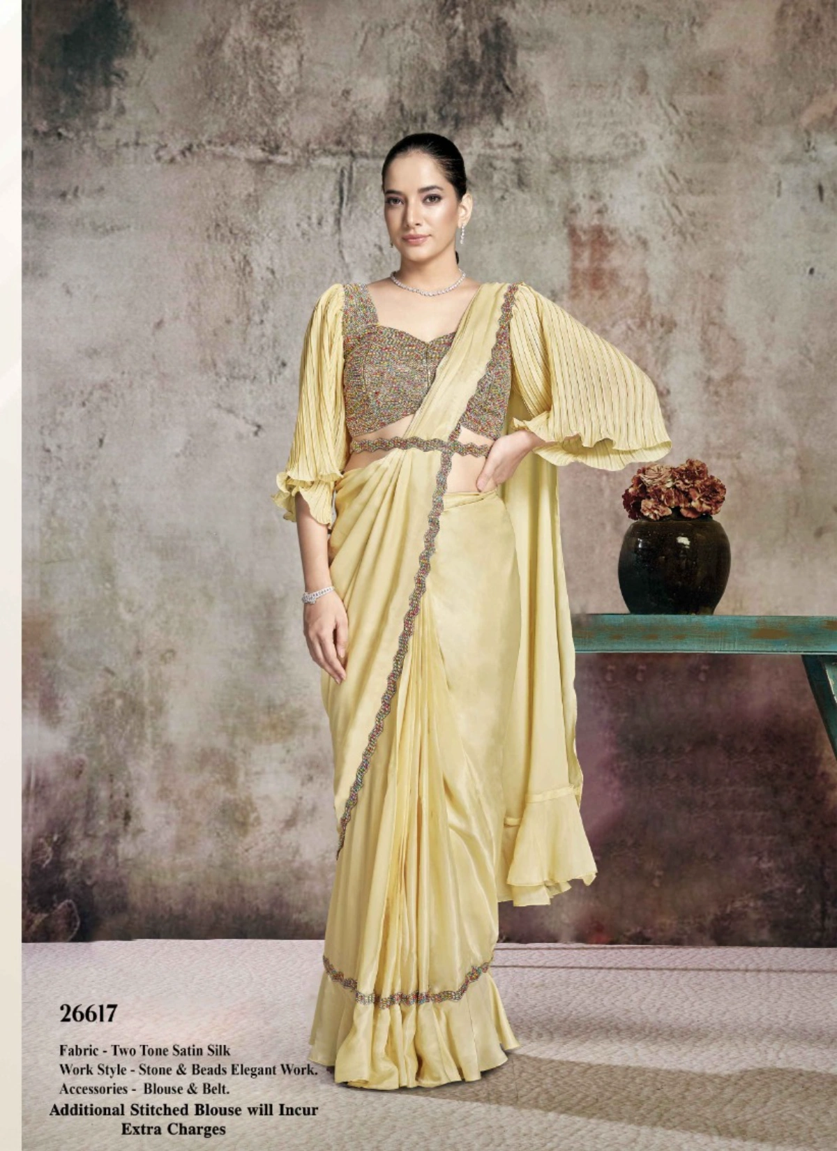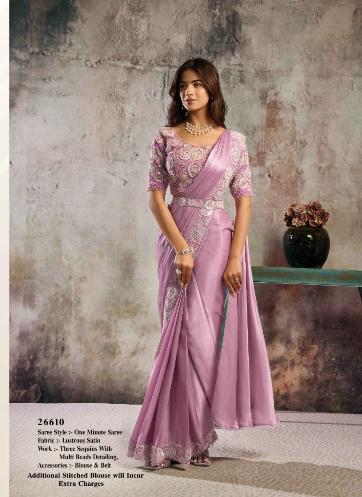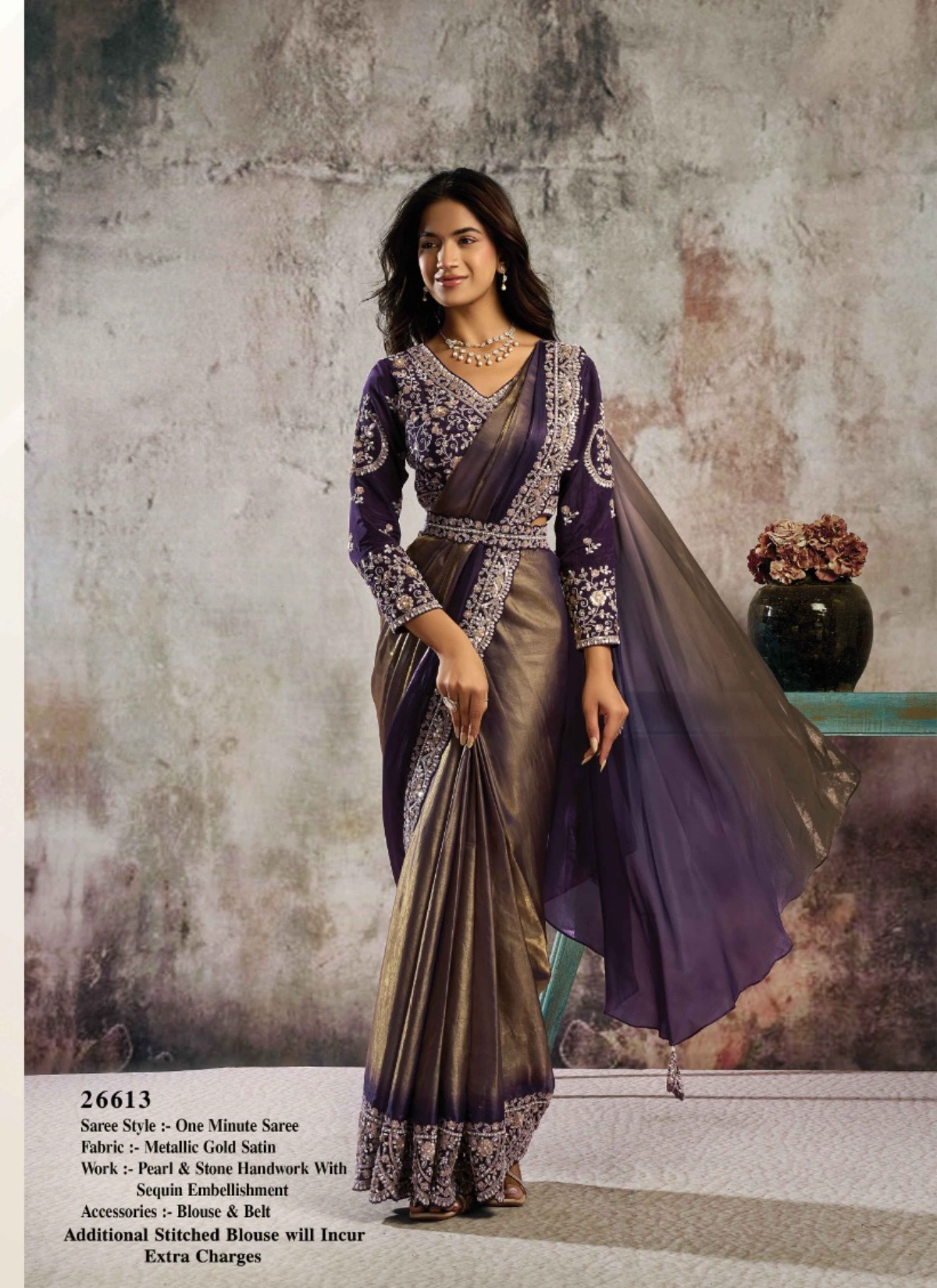 - The saree comes with a stitched blouse, tailored up to 38 inches with margin extendable up to 42 inches, ensuring a flattering and convenient fit for multiple body types. This ready-to-wear advantage makes it a perfect pick for boutiques, resellers, and customers looking for hassle-free luxury ethnic wear.