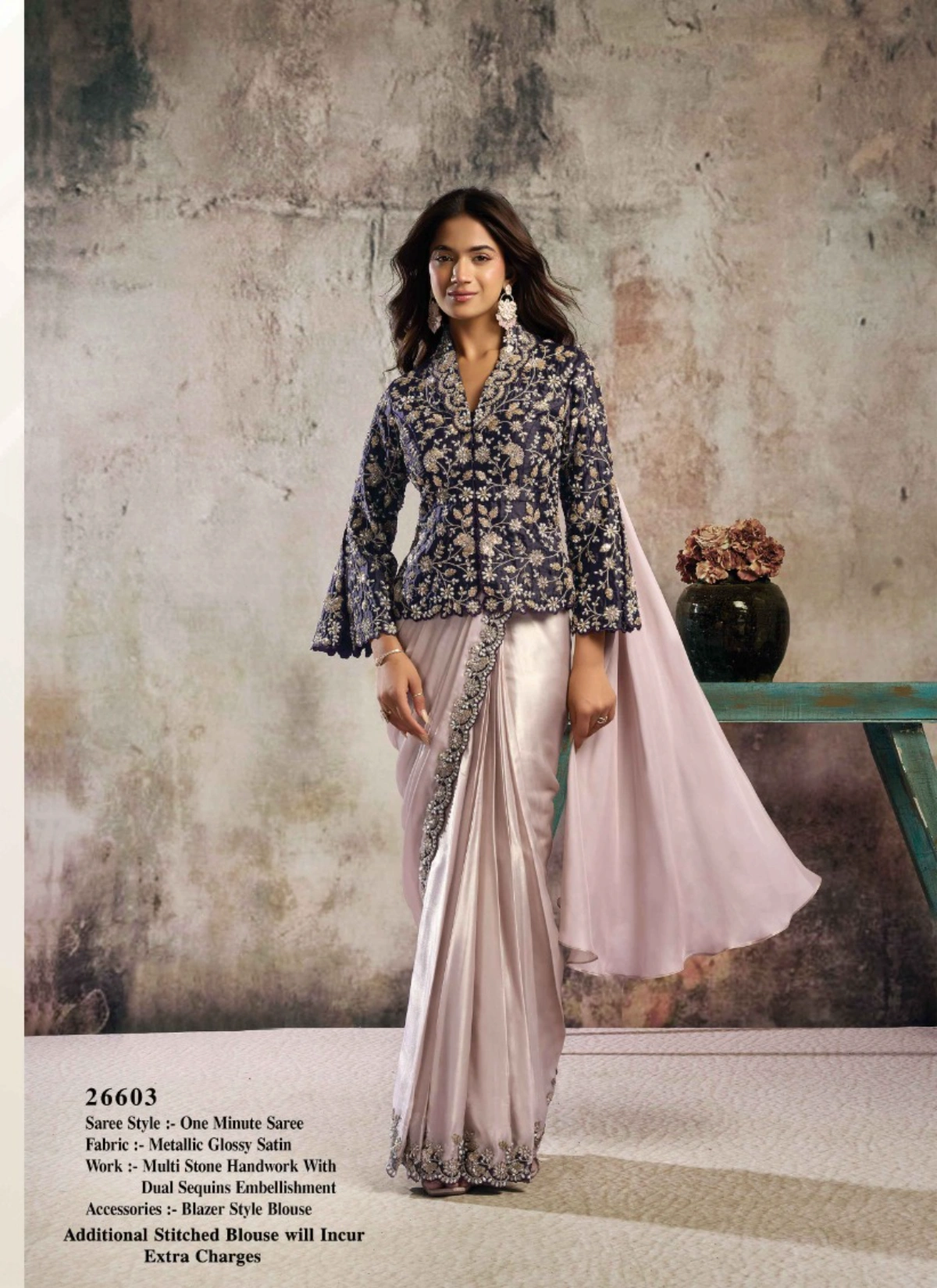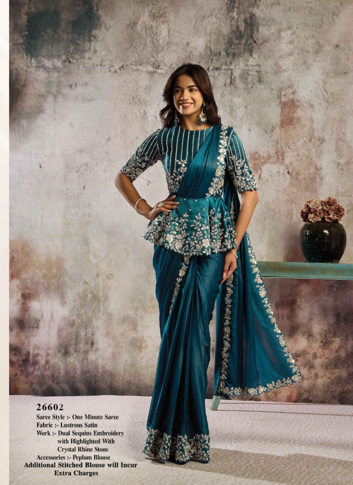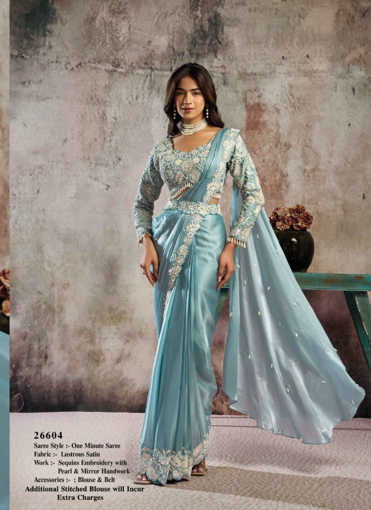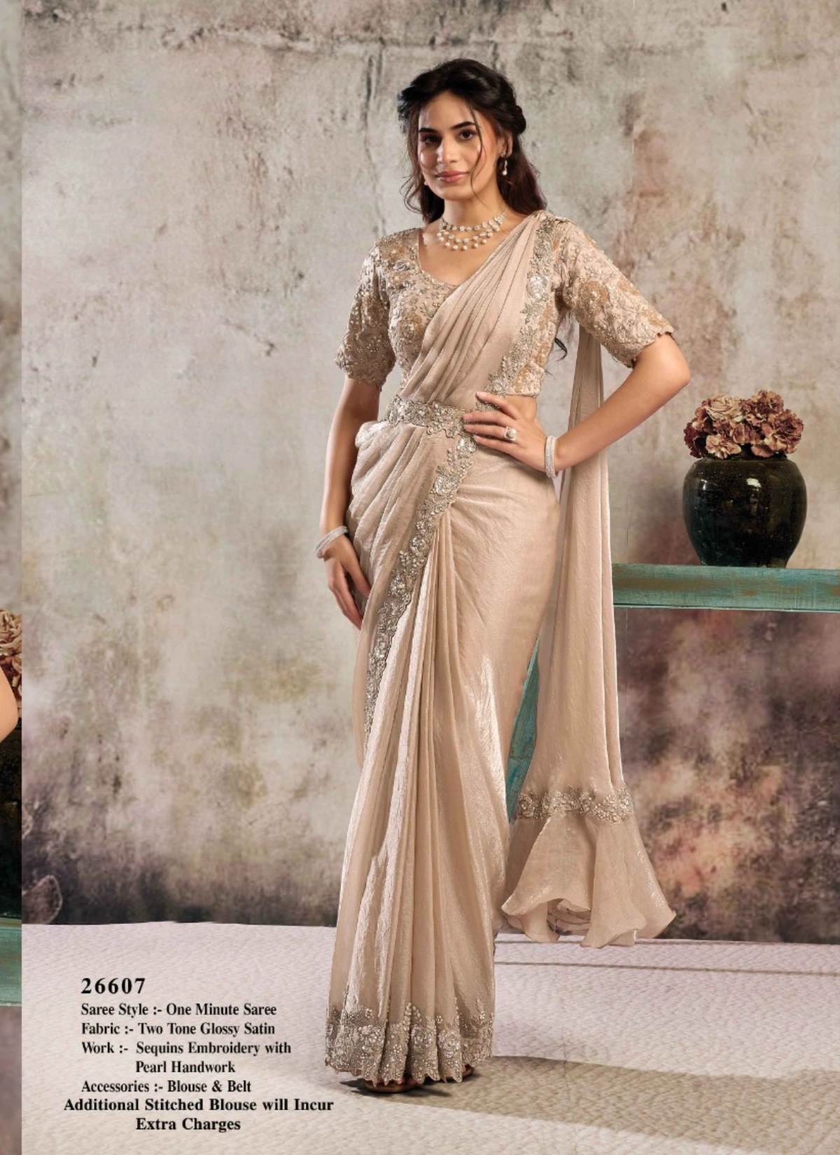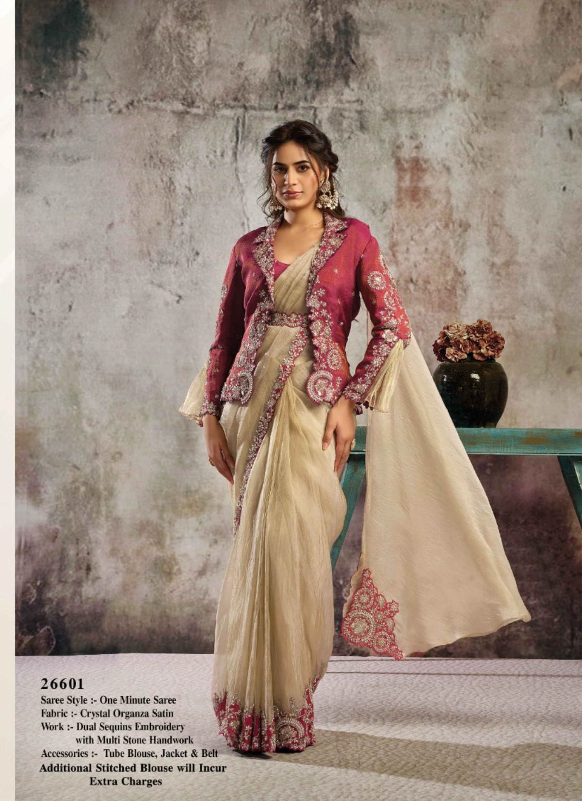 - The saree comes with a stitched blouse, tailored up to 38 inches with margin extendable up to 42 inches, ensuring a flattering and convenient fit for multiple body types. This ready-to-wear advantage makes it a perfect pick for boutiques, resellers, and customers looking for hassle-free luxury ethnic wear.