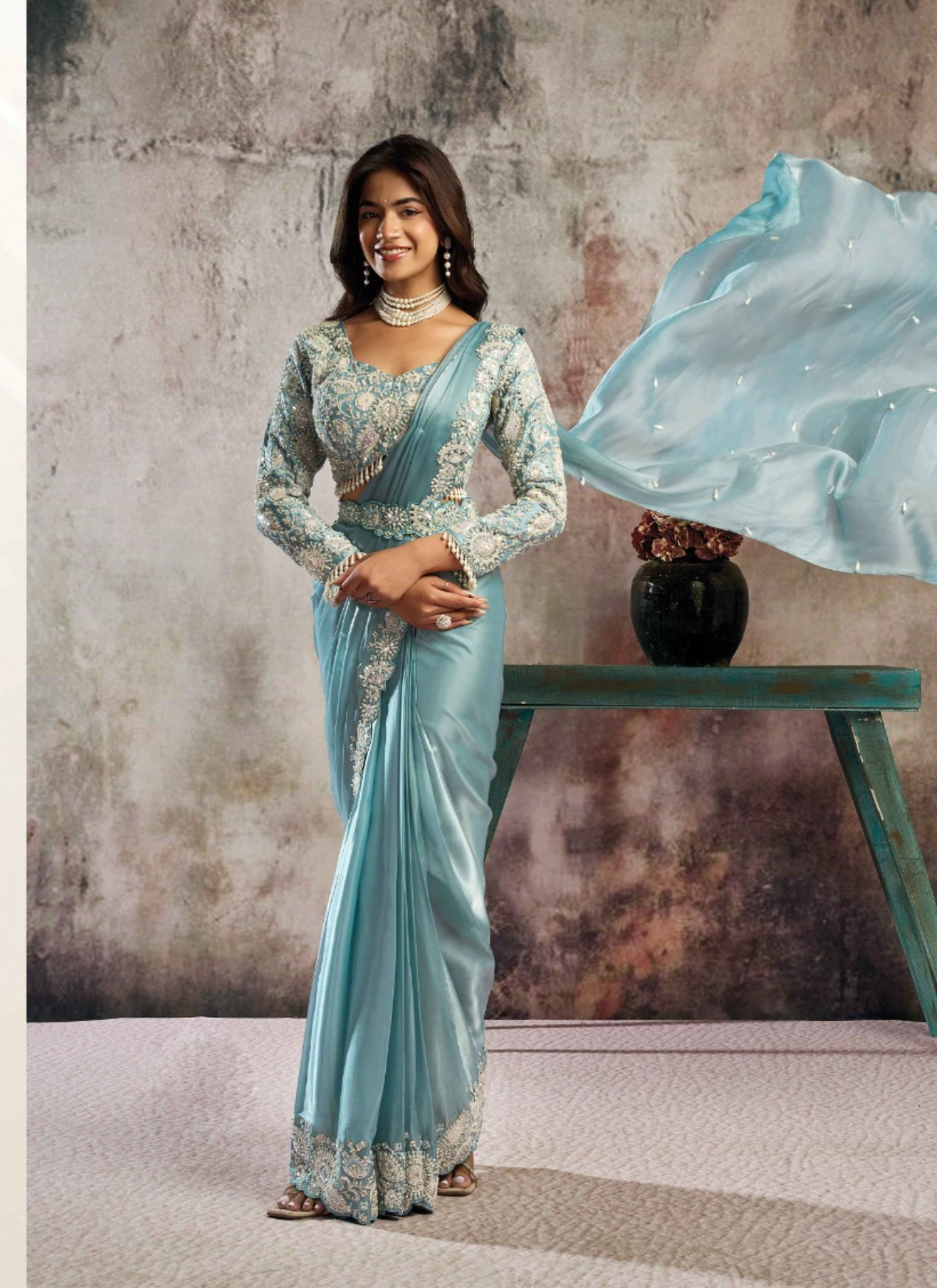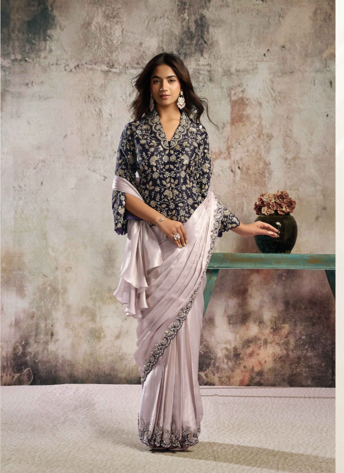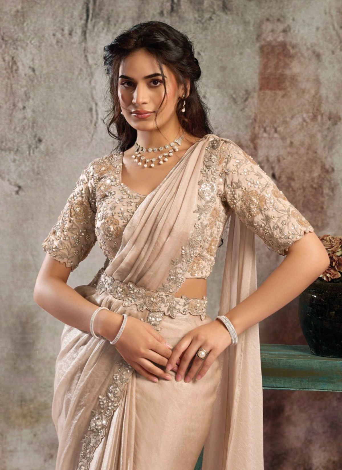 - Designed on luxurious fabric (as per attached details), this saree flows gracefully while maintaining a structured, couture-inspired drape—making it an ideal choice for cocktail parties, wedding receptions, festive soirées, and high-end celebrations. The designer appeal ensures a refined look with minimal effort, offering both comfort and sophistication.