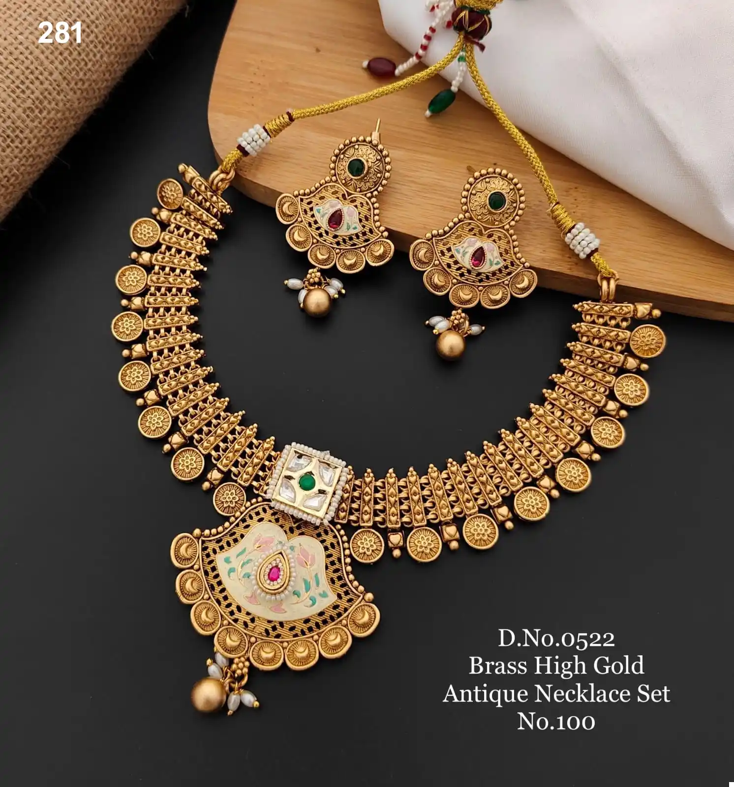 Antique Necklace Set, Brass Jewelry, High Gold Finish, Enamel Work Jewelry, Traditional Design, Gemstone Accents, Wedding Jewelry, Ethnic Necklace, Handcrafted Accessory, Filigree Detailing.