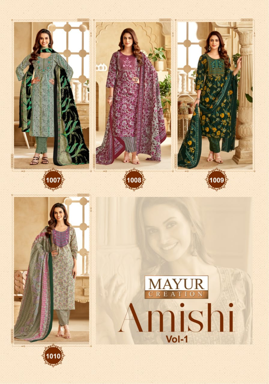 Discover the Mayur Amishi Vol-1 collection, a perfect blend of style and comfort featuring cotton printed kurti pant sets with dupatta. This collection includes 10 sets, each with a pure cotton printed top featuring embroidery neck patch work, available in sizes L (40), XL (42), 2XL (44), and 3XL (46). The matching bottom is a pure cotton printed pant style with pockets, designed for a relaxed and chic look. The dupatta is made from pure cotton printed fabric, measuring 2.25 meters. Priced at ₹555/- per piece (₹5550/- for the full set), with GST included, the total price is ₹5827.50/-. Ready to ship within 4–5 working days.