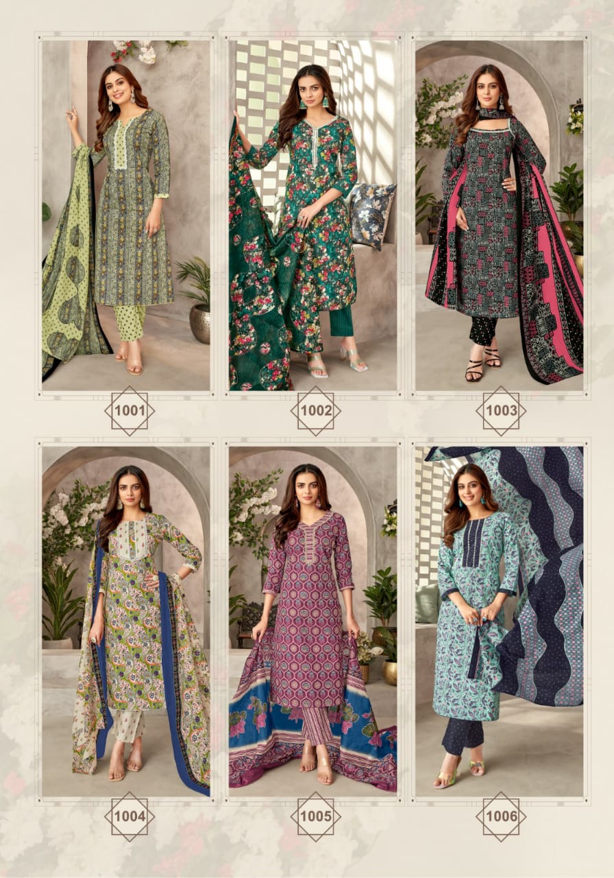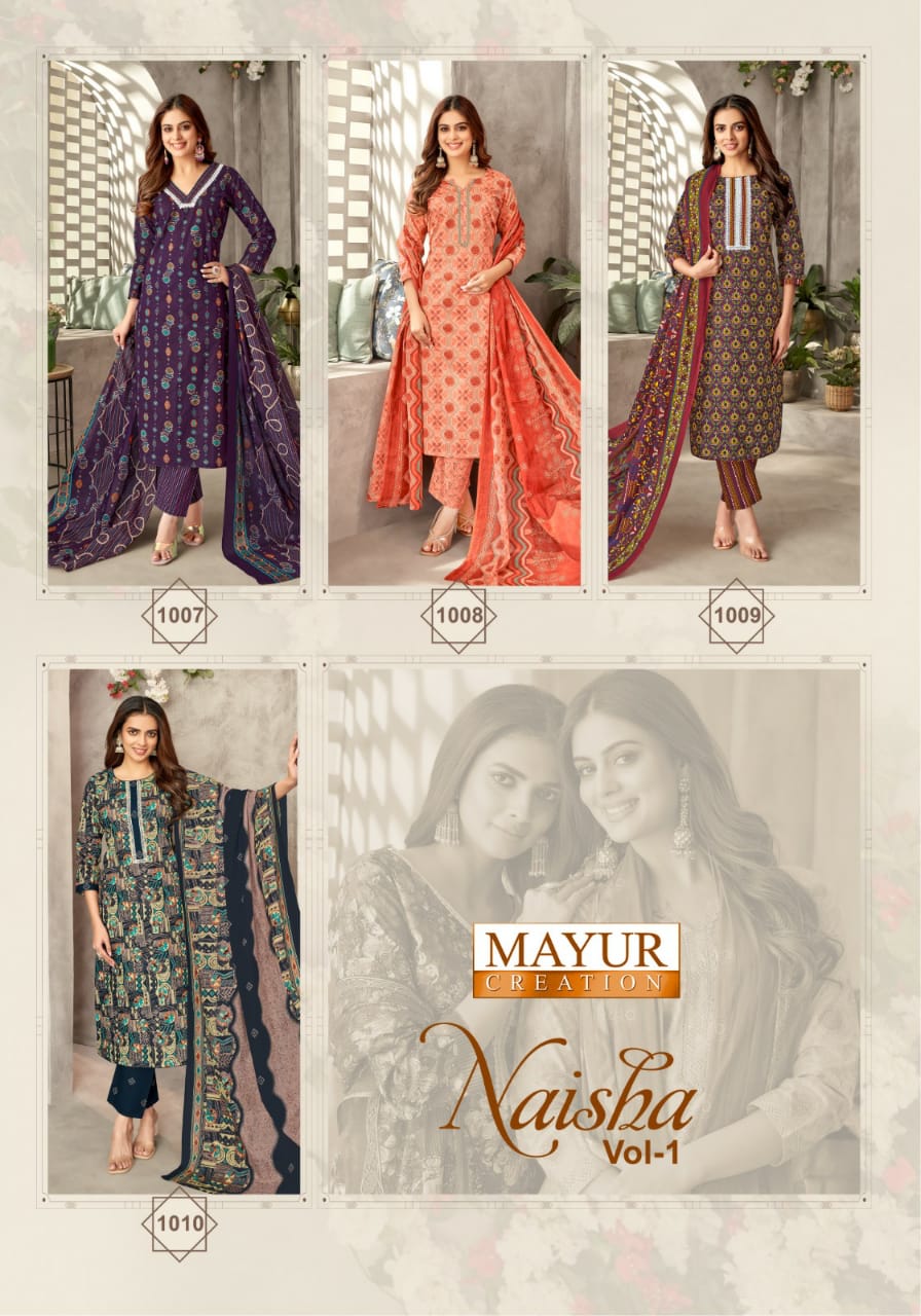 Elevate your ethnic style with the Mayur Naisha Vol 1 collection. Made from high-quality cotton, this collection offers comfort and elegance in a variety of 10 beautiful designs.
