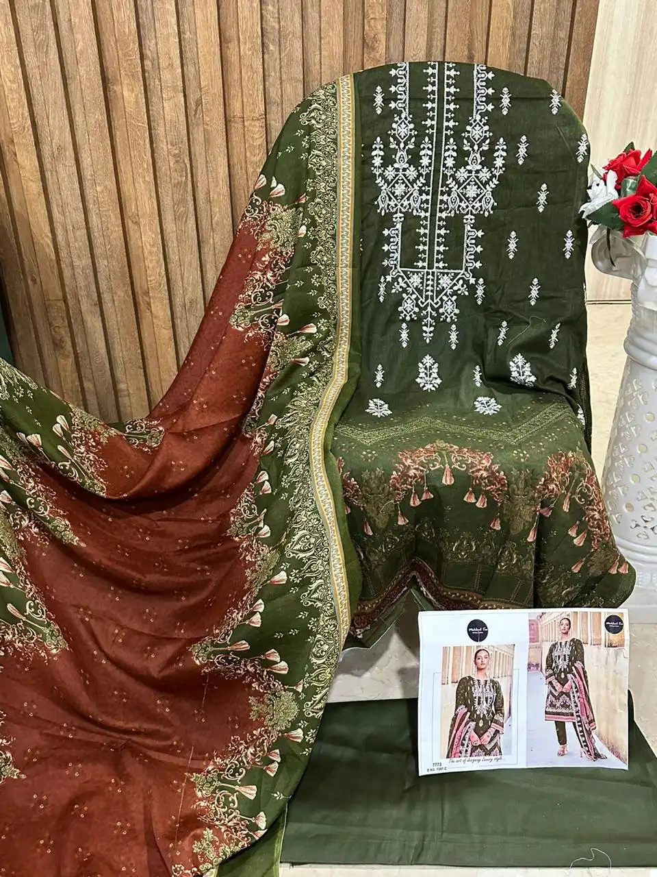 - Dupatta: Cotton Lawn – The scarf or dupatta of the outfit is made of cotton lawn material.