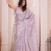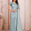 - Blouse: Same Fabric Running Blouse With Zircon Cutwork Border – The blouse accompanying the saree is made of the same fabric and features a zircon cutwork border.
