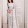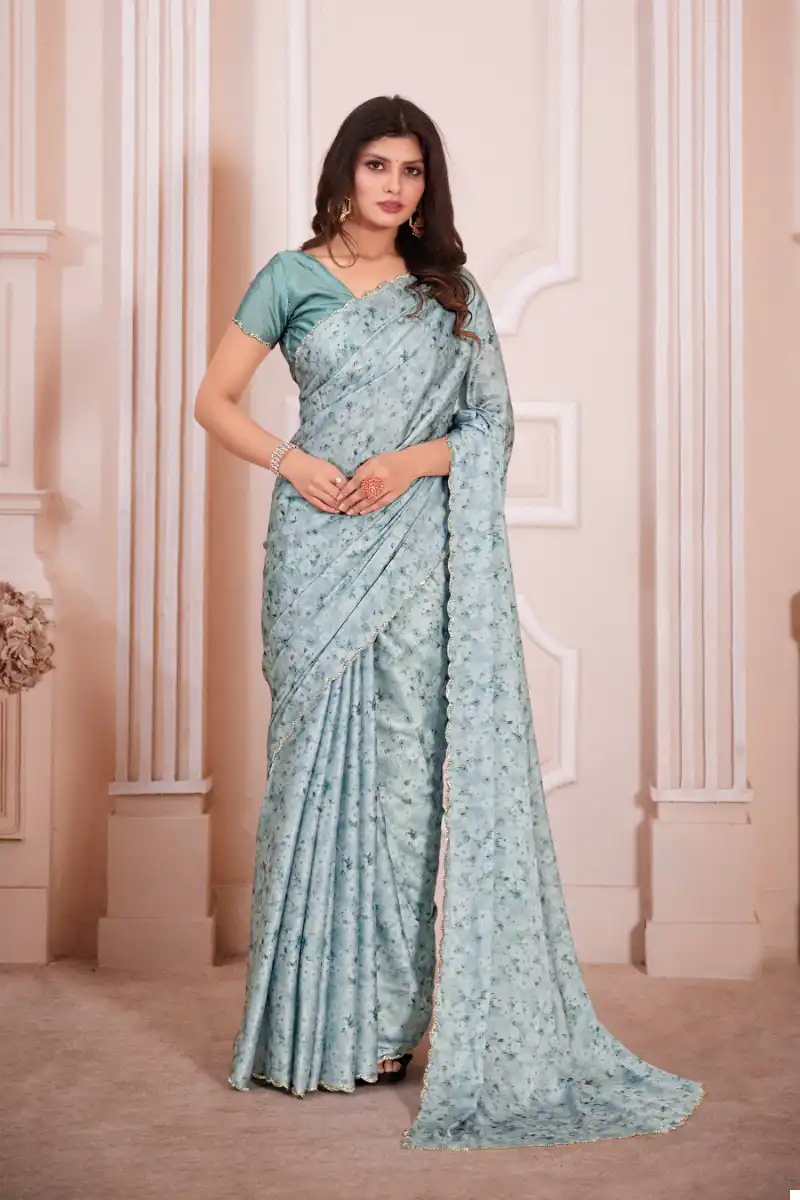 - Saree: Pure Satin Georgette Digital Print Fabric With Heavy Handwork Zircon Cutwork Border – This describes the saree, which is made of pure satin georgette digital print fabric with heavy handwork zircon cutwork border.