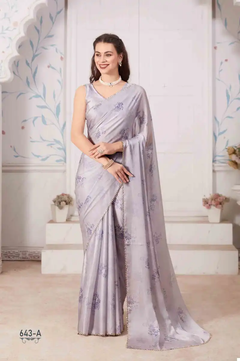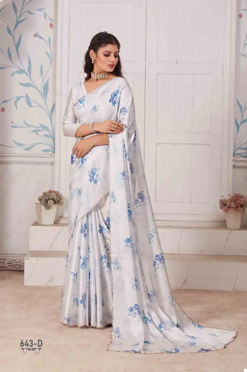 - Saree: Pure Satin Georgette Digital Print Fabric With Heavy Handwork Zircon Cutwork Border