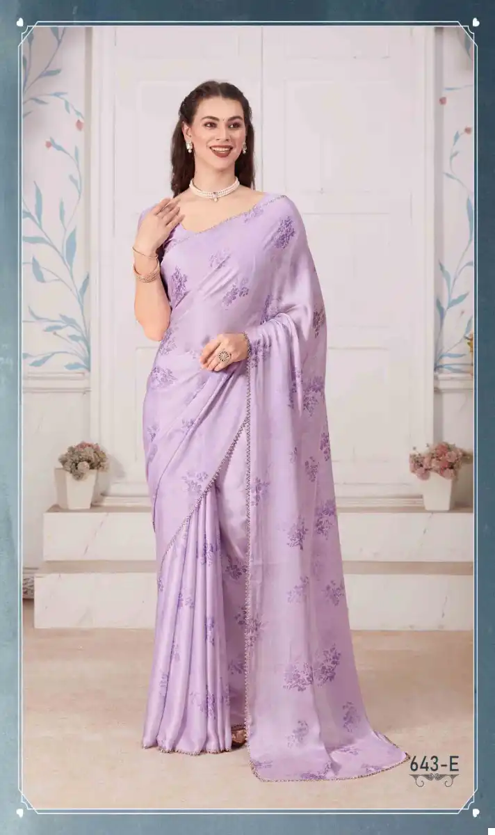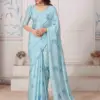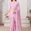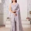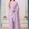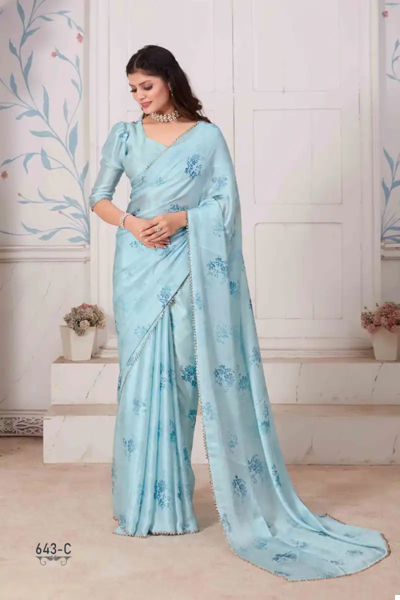 - Blouse: The blouse is made from the same fabric as the saree and also includes a zircon cutwork border.