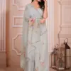 - Blouse: The blouse is made from the same fabric as the saree and also includes a zircon cutwork border.
