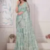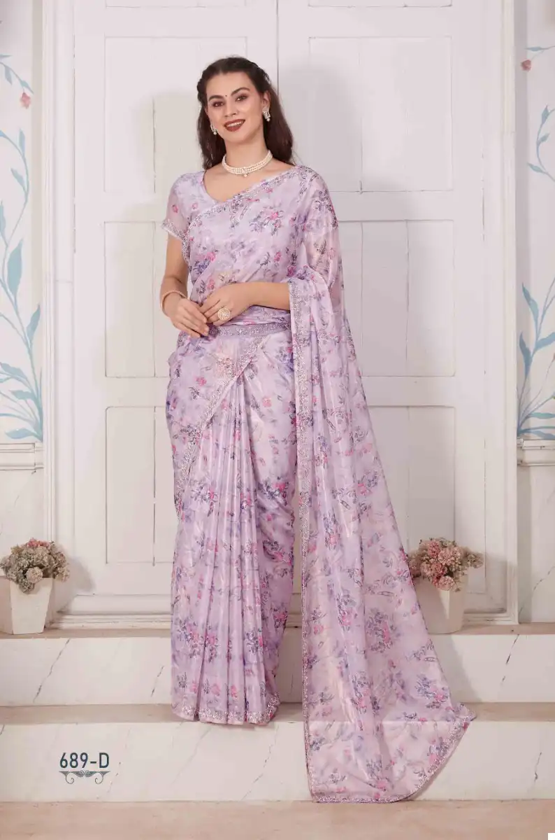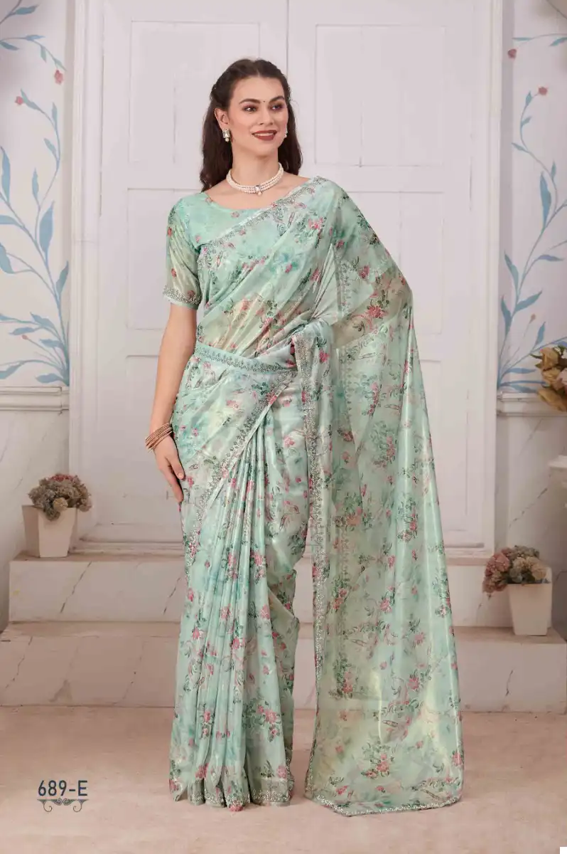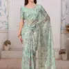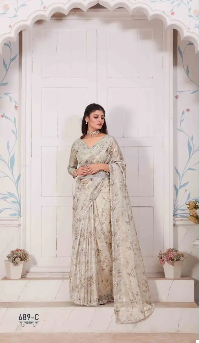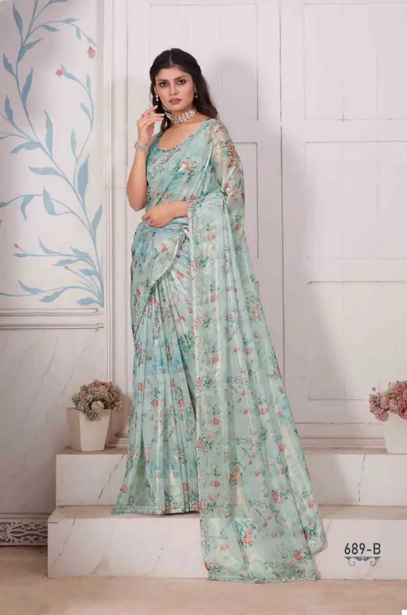 - Saree: Georgette Organza Coating Digital Print Fabric with Handwork Zircon Border.