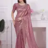 - The blouse is made of the same fabric as the saree and features heavy double zircon work, suggesting intricate and elaborate detailing.