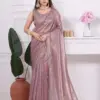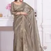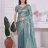 - The saree is made of Raina Net Coating Fabric, which likely provides a smooth and flowing texture, with a heavy handwork zircon border adding embellishment and elegance.
