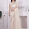 - The saree is made of Raina Net Coating Fabric, which likely provides a smooth and flowing texture, with a heavy handwork zircon border adding embellishment and elegance.
